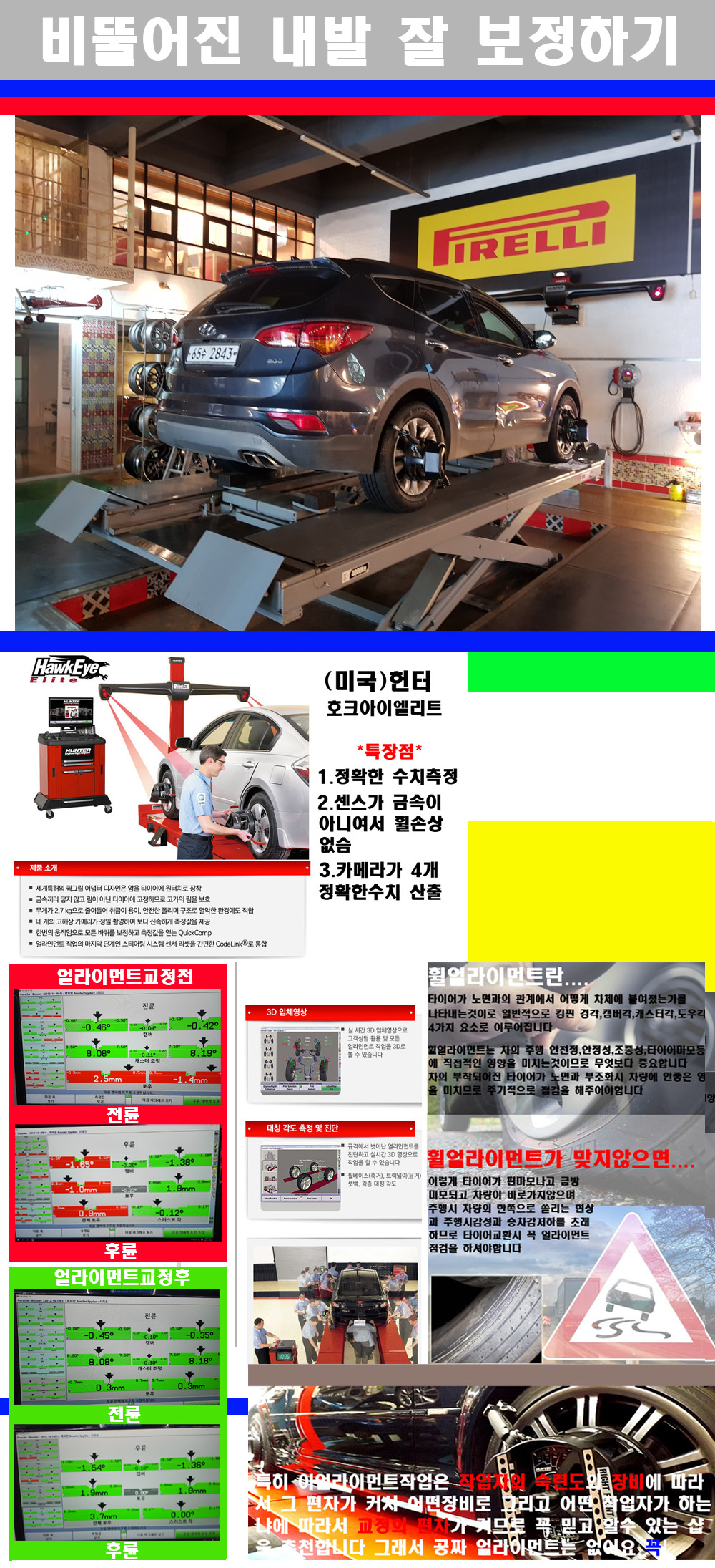 이후 미국 헌터사 호크아이엘리트 장비로 3D얼라이먼트를 진행했습니다 이장비는 현존하는 가장 진화된 얼라이먼트장비입니다 특히 4개의 고성능카메라가 장착되어져 있어 실시간으로 오차가 없는 측정값을 구현하며 바퀴당 각 휠센서 클램프가 프라스틱이며 타이어바닦면을 지지하는 방식이여서 휠의 손상이 없는것이 특징입니다 하지만 장비보다 차량의 얼라이먼트를 볼시 작업자의 정성과 그리고 능력과 숙련도가 관견이기에 꼭 휠얼라이먼트를 장사수단으로 하지않는 샵을 권장합니다 자사는 얼라이먼트정렬시 교정전 교정후를 구분하여 고객님께 직접 이수치값을 확인시켜드리고 작업을 하며 이후 각각의 특성을 가진 타이어들에 대해서 설명 및 관리요령 운전요령 같이 설명해드리고 있습니다 이후 타이어와 휠의 정확한 발란스값과 진동값을 보정후 헌터사 호크아이엘리트 3D얼라이먼트장비로 공장에서 처음 출고될시의 팩토리값으로 교정하였습니다 그리고 타이어질소가스주입기로 3번정도 진공상태로 만든후 질소가스를 주입했습니다 질소가스주입시 가장 관견은 순도이기에 이런 여러번의 진공상태후 주입하고 빼주는 과정를 많이 해주어야합니다 질소가스의 주입시 타이어공기압의 저하가 덜하고 화합물질이 반응을 하지않아 소음전파력과 그리고 타이어안쪽에 수분을 발생하지않으며 타이어안쪽에서의 공기압이 팽창하지않아 타이어에 스트레스를 덜주게 됩니다 하지만 이부분도 공기속에 질소가 80%정도 존재하기에 미미한 차이이지만 질소순도를 높이고 주행시 좋은 점이 확연히 많기에 질소주입을 해드리고 있습니다 특히 고성능타이어나 하중값을 많이 주는 타이어일경우에는 위에서 언급한 부분에서 많이 차이를 보이고 있습니다 이후 타이어왁싱후 출고했습니다+ 감사합니다 |
