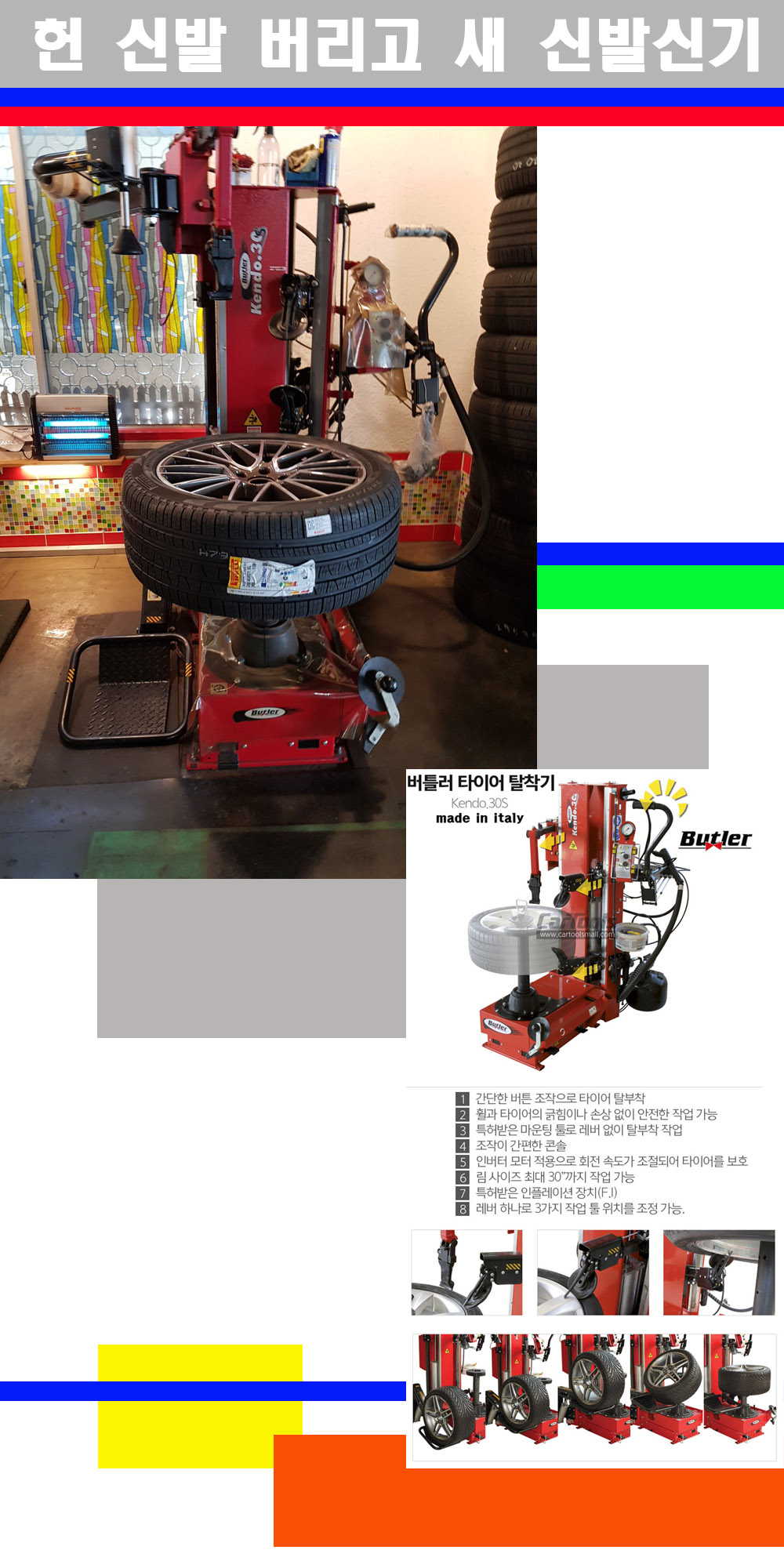 이태리 버틀러사의 켄도3.0S는 휠과 타이어와 조립과 분리시 전혀 제품에 손상을 주지않는 탈착기로 특히 센터락방식(중앙에서 휠를 고정하는 방식)이여서 휠의 중앙부위 잡아서 타이어를 탈부착하고 이후 상하롤러로 타이어를 탈부착합니다 특히 유니포미티작업(휠의 가장가벼운부분과 타이어의 가장 무거운부분을 매칭시키는 작업)시 작업자가 타이어를 정확한 지점에 휠과 매칭시킬수 있는 장점도 있습니다 유니포미티작업 불량시 과도한 진동값으로 핸들링불안 승차감저하 과도한 노면의 충격흡수를 가져와 주행감성을 해치는 첫번째 이유입니다 하지만 이런 작업을 무시하고 그냥 정적인 휠발란스작업만 하는것이 현실입니다 보통 타이어가격만 생각하시고 장착을 하시는데 꼭 이런 부분까지 챙길수 있는 샵을 권장합니다