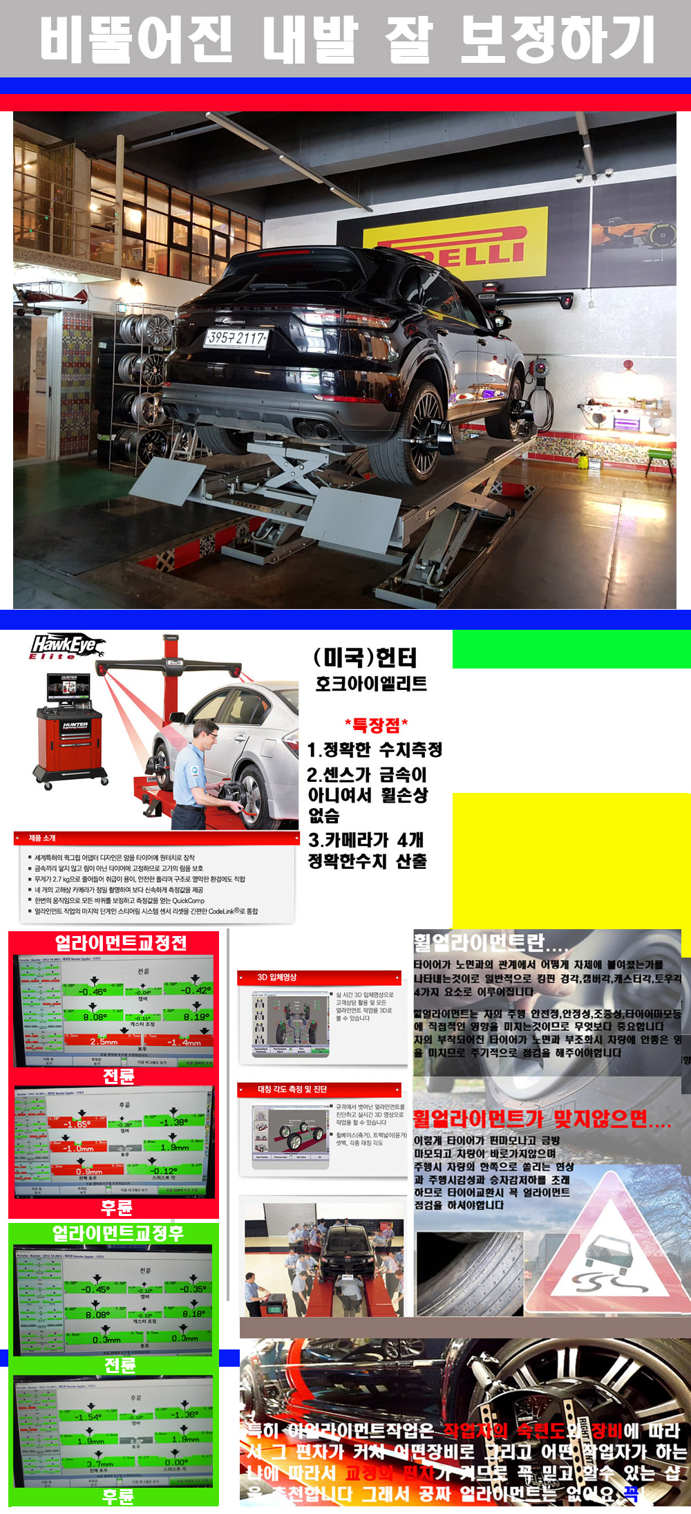 이후 미국 헌터사 호크아이엘리트 장비로 3D얼라이먼트를 진행했습니다 이장비는 현존하는 가장 진화된 얼라이먼트장비입니다 특히 4개의 고성능카메라가 장착되어져 있어 실시간으로 오차가 없는 측정값을 구현하며 바퀴당 각 휠센서 클램프가 프라스틱이며 타이어바닦면을 지지하는 방식이여서 휠의 손상이 없는것이 특징입니다 하지만 장비보다 차량의 얼라이먼트를 볼시 작업자의 정성과 그리고 능력과 숙련도가 관견이기에 꼭 휠얼라이먼트를 장사수단으로 하지않는 샵을 권장합니다 자사는 얼라이먼트정렬시 교정전 교정후를 구분하여 고객님께 직접 이수치값을 확인시켜드리고 작업을 하며 이후 각각의 특성을 가진 타이어들에 대해서 설명 및 관리요령 운전요령 같이 설명해드리고 있습니다 이후 타이어와 휠의 정확한 발란스값과 진동값을 보정후 헌터사 호크아이엘리트 3D얼라이먼트장비로 공장에서 처음 출고될시의 팩토리값으로 교정하였습니다 그리고 타이어질소가스주입기로 3번정도 진공상태로 만든후 질소가스를 주입했습니다 질소가스주입시 가장 관견은 순도이기에 이런 여러번의 진공상태후 주입하고 빼주는 과정를 많이 해주어야합니다 질소가스의 주입시 타이어공기압의 저하가 덜하고 화합물질이 반응을 하지않아 소음전파력과 그리고 타이어안쪽에 수분을 발생하지않으며 타이어안쪽에서의 공기압이 팽창하지않아 타이어에 스트레스를 덜주게 됩니다 하지만 이부분도 공기속에 질소가 80%정도 존재하기에 미미한 차이이지만 질소순도를 높이고 주행시 좋은 점이 확연히 많기에 질소주입을 해드리고 있습니다 특히 고성능타이어나 하중값을 많이 주는 타이어일경우에는 위에서 언급한 부분에서 많이 차이를 보이고 있습니다 이후 타이어왁싱후 출고했습니다+ 감사합니다 |