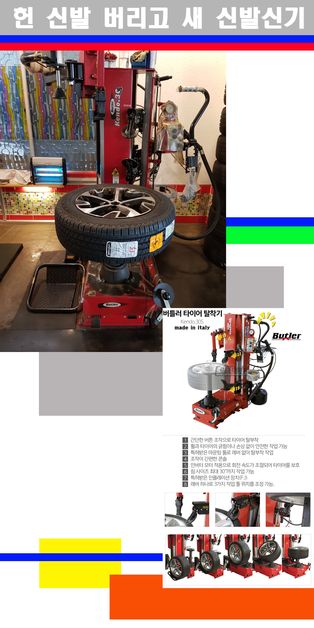 이태리 버틀러사의 켄도3.0S는 휠과 타이어와 조립과 분리시 전혀 제품에 손상을 주지않는 탈착기로 특히 센터락방식(중앙에서 휠를 고정하는 방식)이여서 휠의 중앙부위 잡아서 타이어를 탈부착하고 이후 상하롤러로 타이어를 탈부착합니다 특히 유니포미티작업(휠의 가장가벼운부분과 타이어의 가장 무거운부분을 매칭시키는 작업)시 작업자가 타이어를 정확한 지점에 휠과 매칭시킬수 있는 장점도 있습니다 유니포미티작업 불량시 과도한 진동값으로 핸들링불안 승차감저하 과도한 노면의 충격흡수를 가져와 주행감성을 해치는 첫번째 이유입니다 하지만 이런 작업을 무시하고 그냥 정적인 휠발란스작업만 하는것이 현실입니다 보통 타이어가격만 생각하시고 장착을 하시는데 꼭 이런 부분까지 챙길수 있는 샵을 권장합니다