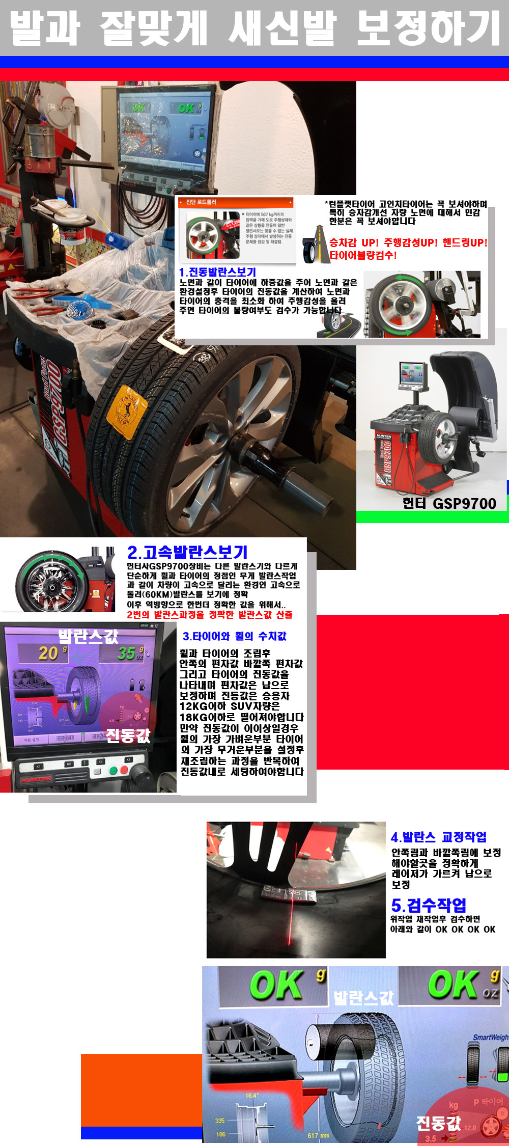이후 미국 헌터사 GSP9700장비로 고속 및 진동발란스로 더욱더 작업의 정확도와 정밀도를 높였습니다 이장비는 노면에서 올라오는 진동값까지 계산하여 발란스값을 보는 방식으로 진동발란스기는 헌터사GSP9700장비가 유일합니다 이후 역방향으로 60키로의 고속으로 다시 발란스값을 보정하는 방식입니다 그래서 노면에서 올라오는 진동를 잡을수 있으며 특히 타이어의 노면력 측정으로 타이어의 불량여부까지도 검수가 가능한 장비입니다 특히 고속발란스 측정시 타사 발란스기와 틀리게 고속으로 발란스를 보기에 차량이 고속으로 달리는 시뮤레이션 구현이 가능하여 정확한 발란스값을 볼수가 있습니다 그리고 작업자에게는 불필요한 발란스납을 붙이지 않아 미관상으로 좋고 납을 절약하는 고객님에게도윈이고 작업자에게도 윈윈할수 있는 장비입니다 그리고 시중에서 고속진동발란스라고 말하시는 샵들이 많은데 꼭아셔야하는것은 고속발란스는 말그대로 발란스를 볼때 고속으로 돌리기에 60키로 전후 그리고 진동값을 계산하기위해서는 발란스기에 진동롤러가 있어야합니다 그래서 미국헌터사 GSP9700장비가 유일합니다 다른 샵에서 말하는 발란스기는 고속진동발란스기능없는 일반발란스 기기입니다 이점 꼭 아시고 장착하시기를 바랍니다