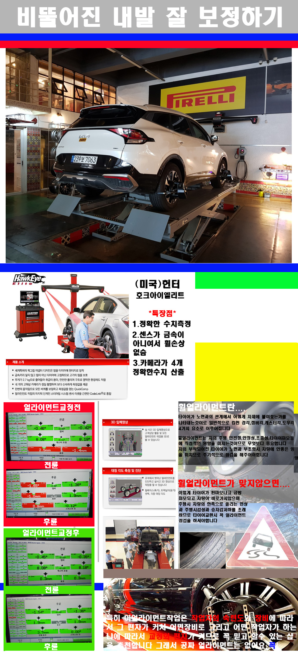 이후 미국 헌터사 호크아이엘리트 장비로 3D얼라이먼트를 진행했습니다 이장비는 현존하는 가장 진화된 얼라이먼트장비입니다 특히 4개의 고성능카메라가 장착되어져 있어 실시간으로 오차가 없는 측정값을 구현하며 바퀴당 각 휠센서 클램프가 프라스틱이며 타이어바닦면을 지지하는 방식이여서 휠의 손상이 없는것이 특징입니다 하지만 장비보다 차량의 얼라이먼트를 볼시 작업자의 정성과 그리고 능력과 숙련도가 관견이기에 꼭 휠얼라이먼트를 장사수단으로 하지않는 샵을 권장합니다 자사는 얼라이먼트정렬시 교정전 교정후를 구분하여 고객님께 직접 이수치값을 확인시켜드리고 작업을 하며 이후 각각의 특성을 가진 타이어들에 대해서 설명 및 관리요령 운전요령 같이 설명해드리고 있습니다 이후 타이어와 휠의 정확한 발란스값과 진동값을 보정후 헌터사 호크아이엘리트 3D얼라이먼트장비로 공장에서 처음 출고될시의 팩토리값으로 교정하였습니다 그리고 타이어질소가스주입기로 3번정도 진공상태로 만든후 질소가스를 주입했습니다 질소가스주입시 가장 관견은 순도이기에 이런 여러번의 진공상태후 주입하고 빼주는 과정를 많이 해주어야합니다 질소가스의 주입시 타이어공기압의 저하가 덜하고 화합물질이 반응을 하지않아 소음전파력과 그리고 타이어안쪽에 수분을 발생하지않으며 타이어안쪽에서의 공기압이 팽창하지않아 타이어에 스트레스를 덜주게 됩니다 하지만 이부분도 공기속에 질소가 80%정도 존재하기에 미미한 차이이지만 질소순도를 높이고 주행시 좋은 점이 확연히 많기에 질소주입을 해드리고 있습니다 특히 고성능타이어나 하중값을 많이 주는 타이어일경우에는 위에서 언급한 부분에서 많이 차이를 보이고 있습니다 이후 타이어왁싱후 출고했습니다+ 감사합니다 |