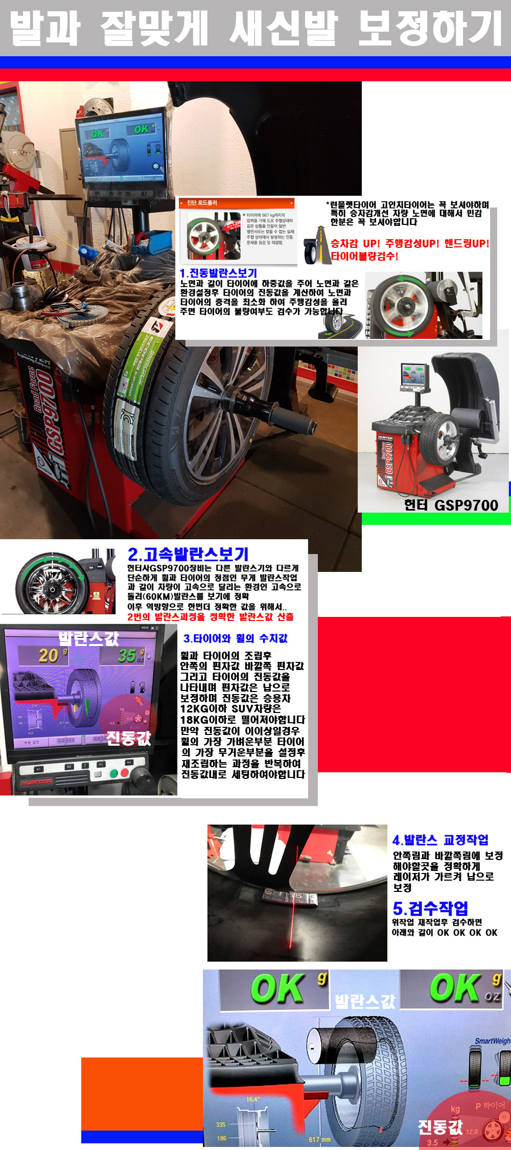 이후 미국 헌터사 GSP9700장비로 고속 및 진동발란스로 더욱더 작업의 정확도와 정밀도를 높였습니다 이장비는 노면에서 올라오는 진동값까지 계산하여 발란스값을 보는 방식으로 진동발란스기는 헌터사GSP9700장비가 유일합니다 이후 역방향으로 60키로의 고속으로 다시 발란스값을 보정하는 방식입니다 그래서 노면에서 올라오는 진동를 잡을수 있으며 특히 타이어의 노면력 측정으로 타이어의 불량여부까지도 검수가 가능한 장비입니다 특히 고속발란스 측정시 타사 발란스기와 틀리게 고속으로 발란스를 보기에 차량이 고속으로 달리는 시뮤레이션 구현이 가능하여 정확한 발란스값을 볼수가 있습니다 그리고 작업자에게는 불필요한 발란스납을 붙이지 않아 미관상으로 좋고 납을 절약하는 고객님에게도윈이고 작업자에게도 윈윈할수 있는 장비입니다 그리고 시중에서 고속진동발란스라고 말하시는 샵들이 많은데 꼭아셔야하는것은 고속발란스는 말그대로 발란스를 볼때 고속으로 돌리기에 60키로 전후 그리고 진동값을 계산하기위해서는 발란스기에 진동롤러가 있어야합니다 그래서 미국헌터사 GSP9700장비가 유일합니다 다른 샵에서 말하는 발란스기는 고속진동발란스기능없는 일반발란스 기기입니다 이점 꼭 아시고 장착하시기를 바랍니다