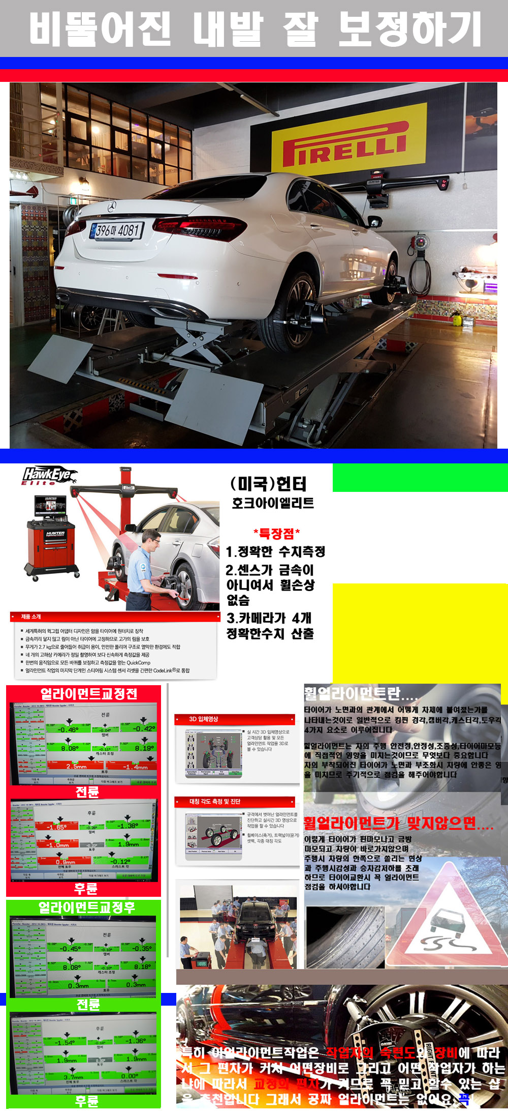 이후 미국 헌터사 호크아이엘리트 장비로 3D얼라이먼트를 진행했습니다 이장비는 현존하는 가장 진화된 얼라이먼트장비입니다 특히 4개의 고성능카메라가 장착되어져 있어 실시간으로 오차가 없는 측정값을 구현하며 바퀴당 각 휠센서 클램프가 프라스틱이며 타이어바닦면을 지지하는 방식이여서 휠의 손상이 없는것이 특징입니다 하지만 장비보다 차량의 얼라이먼트를 볼시 작업자의 정성과 그리고 능력과 숙련도가 관견이기에 꼭 휠얼라이먼트를 장사수단으로 하지않는 샵을 권장합니다 자사는 얼라이먼트정렬시 교정전 교정후를 구분하여 고객님께 직접 이수치값을 확인시켜드리고 작업을 하며 이후 각각의 특성을 가진 타이어들에 대해서 설명 및 관리요령 운전요령 같이 설명해드리고 있습니다 이후 타이어와 휠의 정확한 발란스값과 진동값을 보정후 헌터사 호크아이엘리트 3D얼라이먼트장비로 공장에서 처음 출고될시의 팩토리값으로 교정하였습니다 그리고 타이어질소가스주입기로 3번정도 진공상태로 만든후 질소가스를 주입했습니다 질소가스주입시 가장 관견은 순도이기에 이런 여러번의 진공상태후 주입하고 빼주는 과정를 많이 해주어야합니다 질소가스의 주입시 타이어공기압의 저하가 덜하고 화합물질이 반응을 하지않아 소음전파력과 그리고 타이어안쪽에 수분을 발생하지않으며 타이어안쪽에서의 공기압이 팽창하지않아 타이어에 스트레스를 덜주게 됩니다 하지만 이부분도 공기속에 질소가 80%정도 존재하기에 미미한 차이이지만 질소순도를 높이고 주행시 좋은 점이 확연히 많기에 질소주입을 해드리고 있습니다 특히 고성능타이어나 하중값을 많이 주는 타이어일경우에는 위에서 언급한 부분에서 많이 차이를 보이고 있습니다 이후 타이어왁싱후 출고했습니다+ 감사합니다 |