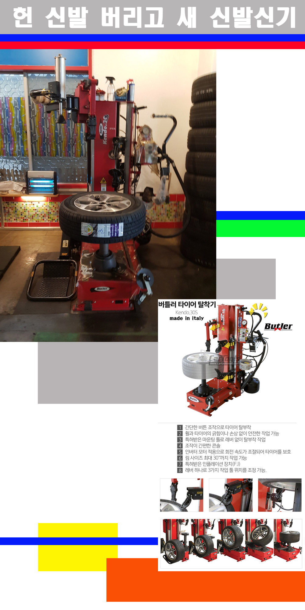 이태리 버틀러사의 켄도3.0S는 휠과 타이어와 조립과 분리시 전혀 제품에 손상을 주지않는 탈착기로 특히 센터락방식(중앙에서 휠를 고정하는 방식)이여서 휠의 중앙부위 잡아서 타이어를 탈부착하고 이후 상하롤러로 타이어를 탈부착합니다 특히 유니포미티작업(휠의 가장가벼운부분과 타이어의 가장 무거운부분을 매칭시키는 작업)시 작업자가 타이어를 정확한 지점에 휠과 매칭시킬수 있는 장점도 있습니다 유니포미티작업 불량시 과도한 진동값으로 핸들링불안 승차감저하 과도한 노면의 충격흡수를 가져와 주행감성을 해치는 첫번째 이유입니다 하지만 이런 작업을 무시하고 그냥 정적인 휠발란스작업만 하는것이 현실입니다 보통 타이어가격만 생각하시고 장착을 하시는데 꼭 이런 부분까지 챙길수 있는 샵을 권장합니다