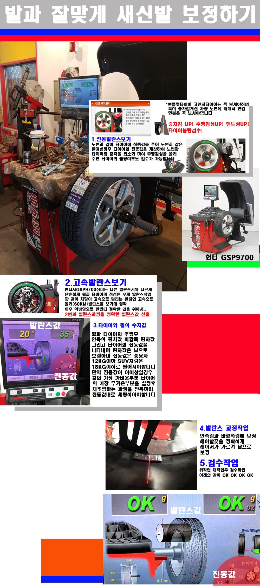 이후 미국 헌터사 GSP9700장비로 고속 및 진동발란스로 더욱더 작업의 정확도와 정밀도를 높였습니다 이장비는 노면에서 올라오는 진동값까지 계산하여 발란스값을 보는 방식으로 진동발란스기는 헌터사GSP9700장비가 유일합니다 이후 역방향으로 60키로의 고속으로 다시 발란스값을 보정하는 방식입니다 그래서 노면에서 올라오는 진동를 잡을수 있으며 특히 타이어의 노면력 측정으로 타이어의 불량여부까지도 검수가 가능한 장비입니다 특히 고속발란스 측정시 타사 발란스기와 틀리게 고속으로 발란스를 보기에 차량이 고속으로 달리는 시뮤레이션 구현이 가능하여 정확한 발란스값을 볼수가 있습니다 그리고 작업자에게는 불필요한 발란스납을 붙이지 않아 미관상으로 좋고 납을 절약하는 고객님에게도윈이고 작업자에게도 윈윈할수 있는 장비입니다 그리고 시중에서 고속진동발란스라고 말하시는 샵들이 많은데 꼭아셔야하는것은 고속발란스는 말그대로 발란스를 볼때 고속으로 돌리기에 60키로 전후 그리고 진동값을 계산하기위해서는 발란스기에 진동롤러가 있어야합니다 그래서 미국헌터사 GSP9700장비가 유일합니다 다른 샵에서 말하는 발란스기는 고속진동발란스기능없는 일반발란스 기기입니다 이점 꼭 아시고 장착하시기를 바랍니다