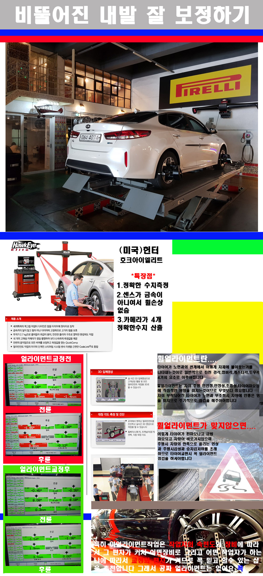 이후 미국 헌터사 호크아이엘리트 장비로 3D얼라이먼트를 진행했습니다 이장비는 현존하는 가장 진화된 얼라이먼트장비입니다 특히 4개의 고성능카메라가 장착되어져 있어 실시간으로 오차가 없는 측정값을 구현하며 바퀴당 각 휠센서 클램프가 프라스틱이며 타이어바닦면을 지지하는 방식이여서 휠의 손상이 없는것이 특징입니다 하지만 장비보다 차량의 얼라이먼트를 볼시 작업자의 정성과 그리고 능력과 숙련도가 관견이기에 꼭 휠얼라이먼트를 장사수단으로 하지않는 샵을 권장합니다 자사는 얼라이먼트정렬시 교정전 교정후를 구분하여 고객님께 직접 이수치값을 확인시켜드리고 작업을 하며 이후 각각의 특성을 가진 타이어들에 대해서 설명 및 관리요령 운전요령 같이 설명해드리고 있습니다 이후 타이어와 휠의 정확한 발란스값과 진동값을 보정후 헌터사 호크아이엘리트 3D얼라이먼트장비로 공장에서 처음 출고될시의 팩토리값으로 교정하였습니다 그리고 타이어질소가스주입기로 3번정도 진공상태로 만든후 질소가스를 주입했습니다 질소가스주입시 가장 관견은 순도이기에 이런 여러번의 진공상태후 주입하고 빼주는 과정를 많이 해주어야합니다 질소가스의 주입시 타이어공기압의 저하가 덜하고 화합물질이 반응을 하지않아 소음전파력과 그리고 타이어안쪽에 수분을 발생하지않으며 타이어안쪽에서의 공기압이 팽창하지않아 타이어에 스트레스를 덜주게 됩니다 하지만 이부분도 공기속에 질소가 80%정도 존재하기에 미미한 차이이지만 질소순도를 높이고 주행시 좋은 점이 확연히 많기에 질소주입을 해드리고 있습니다 특히 고성능타이어나 하중값을 많이 주는 타이어일경우에는 위에서 언급한 부분에서 많이 차이를 보이고 있습니다 이후 타이어왁싱후 출고했습니다+ 감사합니다 |