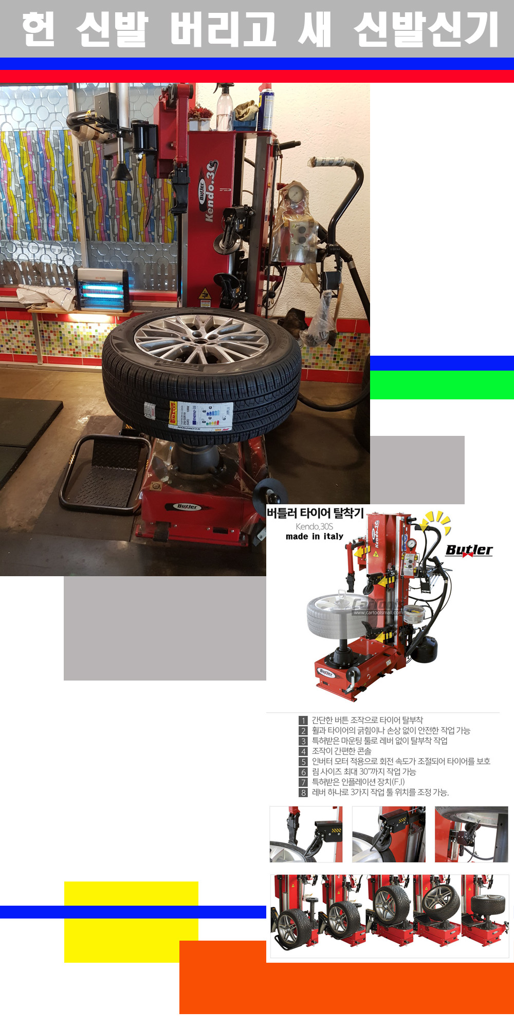 이태리 버틀러사의 켄도3.0S는 휠과 타이어와 조립과 분리시 전혀 제품에 손상을 주지않는 탈착기로 특히 센터락방식(중앙에서 휠를 고정하는 방식)이여서 휠의 중앙부위 잡아서 타이어를 탈부착하고 이후 상하롤러로 타이어를 탈부착합니다 특히 유니포미티작업(휠의 가장가벼운부분과 타이어의 가장 무거운부분을 매칭시키는 작업)시 작업자가 타이어를 정확한 지점에 휠과 매칭시킬수 있는 장점도 있습니다 유니포미티작업 불량시 과도한 진동값으로 핸들링불안 승차감저하 과도한 노면의 충격흡수를 가져와 주행감성을 해치는 첫번째 이유입니다 하지만 이런 작업을 무시하고 그냥 정적인 휠발란스작업만 하는것이 현실입니다 보통 타이어가격만 생각하시고 장착을 하시는데 꼭 이런 부분까지 챙길수 있는 샵을 권장합니다