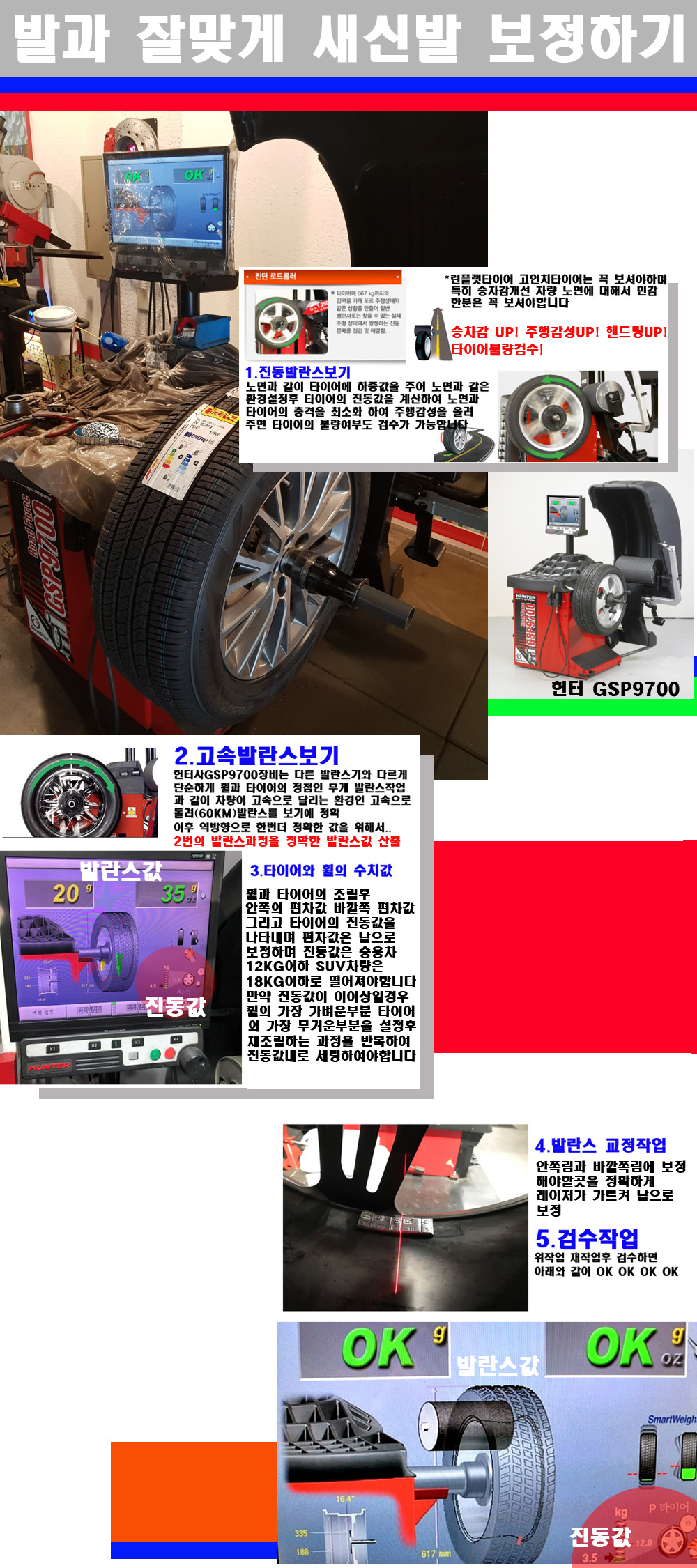 이후 미국 헌터사 GSP9700장비로 고속 및 진동발란스로 더욱더 작업의 정확도와 정밀도를 높였습니다 이장비는 노면에서 올라오는 진동값까지 계산하여 발란스값을 보는 방식으로 진동발란스기는 헌터사GSP9700장비가 유일합니다 이후 역방향으로 60키로의 고속으로 다시 발란스값을 보정하는 방식입니다 그래서 노면에서 올라오는 진동를 잡을수 있으며 특히 타이어의 노면력 측정으로 타이어의 불량여부까지도 검수가 가능한 장비입니다 특히 고속발란스 측정시 타사 발란스기와 틀리게 고속으로 발란스를 보기에 차량이 고속으로 달리는 시뮤레이션 구현이 가능하여 정확한 발란스값을 볼수가 있습니다 그리고 작업자에게는 불필요한 발란스납을 붙이지 않아 미관상으로 좋고 납을 절약하는 고객님에게도윈이고 작업자에게도 윈윈할수 있는 장비입니다 그리고 시중에서 고속진동발란스라고 말하시는 샵들이 많은데 꼭아셔야하는것은 고속발란스는 말그대로 발란스를 볼때 고속으로 돌리기에 60키로 전후 그리고 진동값을 계산하기위해서는 발란스기에 진동롤러가 있어야합니다 그래서 미국헌터사 GSP9700장비가 유일합니다 다른 샵에서 말하는 발란스기는 고속진동발란스기능없는 일반발란스 기기입니다 이점 꼭 아시고 장착하시기를 바랍니다