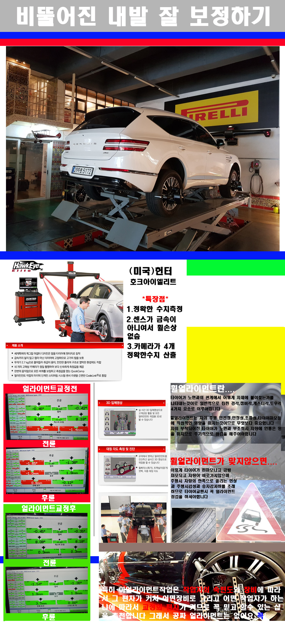 이후 미국 헌터사 호크아이엘리트 장비로 3D얼라이먼트를 진행했습니다 이장비는 현존하는 가장 진화된 얼라이먼트장비입니다 특히 4개의 고성능카메라가 장착되어져 있어 실시간으로 오차가 없는 측정값을 구현하며 바퀴당 각 휠센서 클램프가 프라스틱이며 타이어바닦면을 지지하는 방식이여서 휠의 손상이 없는것이 특징입니다 하지만 장비보다 차량의 얼라이먼트를 볼시 작업자의 정성과 그리고 능력과 숙련도가 관견이기에 꼭 휠얼라이먼트를 장사수단으로 하지않는 샵을 권장합니다 자사는 얼라이먼트정렬시 교정전 교정후를 구분하여 고객님께 직접 이수치값을 확인시켜드리고 작업을 하며 이후 각각의 특성을 가진 타이어들에 대해서 설명 및 관리요령 운전요령 같이 설명해드리고 있습니다 이후 타이어와 휠의 정확한 발란스값과 진동값을 보정후 헌터사 호크아이엘리트 3D얼라이먼트장비로 공장에서 처음 출고될시의 팩토리값으로 교정하였습니다 그리고 타이어질소가스주입기로 3번정도 진공상태로 만든후 질소가스를 주입했습니다 질소가스주입시 가장 관견은 순도이기에 이런 여러번의 진공상태후 주입하고 빼주는 과정를 많이 해주어야합니다 질소가스의 주입시 타이어공기압의 저하가 덜하고 화합물질이 반응을 하지않아 소음전파력과 그리고 타이어안쪽에 수분을 발생하지않으며 타이어안쪽에서의 공기압이 팽창하지않아 타이어에 스트레스를 덜주게 됩니다 하지만 이부분도 공기속에 질소가 80%정도 존재하기에 미미한 차이이지만 질소순도를 높이고 주행시 좋은 점이 확연히 많기에 질소주입을 해드리고 있습니다 특히 고성능타이어나 하중값을 많이 주는 타이어일경우에는 위에서 언급한 부분에서 많이 차이를 보이고 있습니다 이후 타이어왁싱후 출고했습니다+ 감사합니다 |