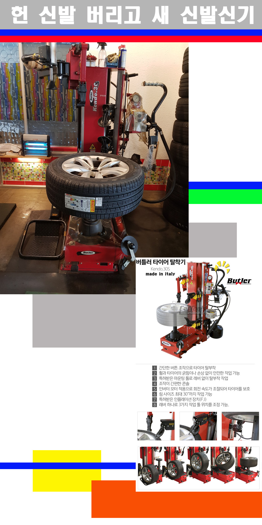 이태리 버틀러사의 켄도3.0S는 휠과 타이어와 조립과 분리시 전혀 제품에 손상을 주지않는 탈착기로 특히 센터락방식(중앙에서 휠를 고정하는 방식)이여서 휠의 중앙부위 잡아서 타이어를 탈부착하고 이후 상하롤러로 타이어를 탈부착합니다 특히 유니포미티작업(휠의 가장가벼운부분과 타이어의 가장 무거운부분을 매칭시키는 작업)시 작업자가 타이어를 정확한 지점에 휠과 매칭시킬수 있는 장점도 있습니다 유니포미티작업 불량시 과도한 진동값으로 핸들링불안 승차감저하 과도한 노면의 충격흡수를 가져와 주행감성을 해치는 첫번째 이유입니다 하지만 이런 작업을 무시하고 그냥 정적인 휠발란스작업만 하는것이 현실입니다 보통 타이어가격만 생각하시고 장착을 하시는데 꼭 이런 부분까지 챙길수 있는 샵을 권장합니다