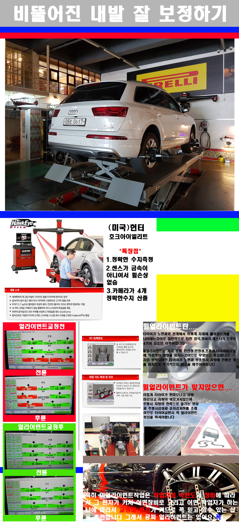 이후 미국 헌터사 호크아이엘리트 장비로 3D얼라이먼트를 진행했습니다 이장비는 현존하는 가장 진화된 얼라이먼트장비입니다 특히 4개의 고성능카메라가 장착되어져 있어 실시간으로 오차가 없는 측정값을 구현하며 바퀴당 각 휠센서 클램프가 프라스틱이며 타이어바닦면을 지지하는 방식이여서 휠의 손상이 없는것이 특징입니다 하지만 장비보다 차량의 얼라이먼트를 볼시 작업자의 정성과 그리고 능력과 숙련도가 관견이기에 꼭 휠얼라이먼트를 장사수단으로 하지않는 샵을 권장합니다 자사는 얼라이먼트정렬시 교정전 교정후를 구분하여 고객님께 직접 이수치값을 확인시켜드리고 작업을 하며 이후 각각의 특성을 가진 타이어들에 대해서 설명 및 관리요령 운전요령 같이 설명해드리고 있습니다 이후 타이어와 휠의 정확한 발란스값과 진동값을 보정후 헌터사 호크아이엘리트 3D얼라이먼트장비로 공장에서 처음 출고될시의 팩토리값으로 교정하였습니다 그리고 타이어질소가스주입기로 3번정도 진공상태로 만든후 질소가스를 주입했습니다 질소가스주입시 가장 관견은 순도이기에 이런 여러번의 진공상태후 주입하고 빼주는 과정를 많이 해주어야합니다 질소가스의 주입시 타이어공기압의 저하가 덜하고 화합물질이 반응을 하지않아 소음전파력과 그리고 타이어안쪽에 수분을 발생하지않으며 타이어안쪽에서의 공기압이 팽창하지않아 타이어에 스트레스를 덜주게 됩니다 하지만 이부분도 공기속에 질소가 80%정도 존재하기에 미미한 차이이지만 질소순도를 높이고 주행시 좋은 점이 확연히 많기에 질소주입을 해드리고 있습니다 특히 고성능타이어나 하중값을 많이 주는 타이어일경우에는 위에서 언급한 부분에서 많이 차이를 보이고 있습니다 이후 타이어왁싱후 출고했습니다+ 감사합니다 |