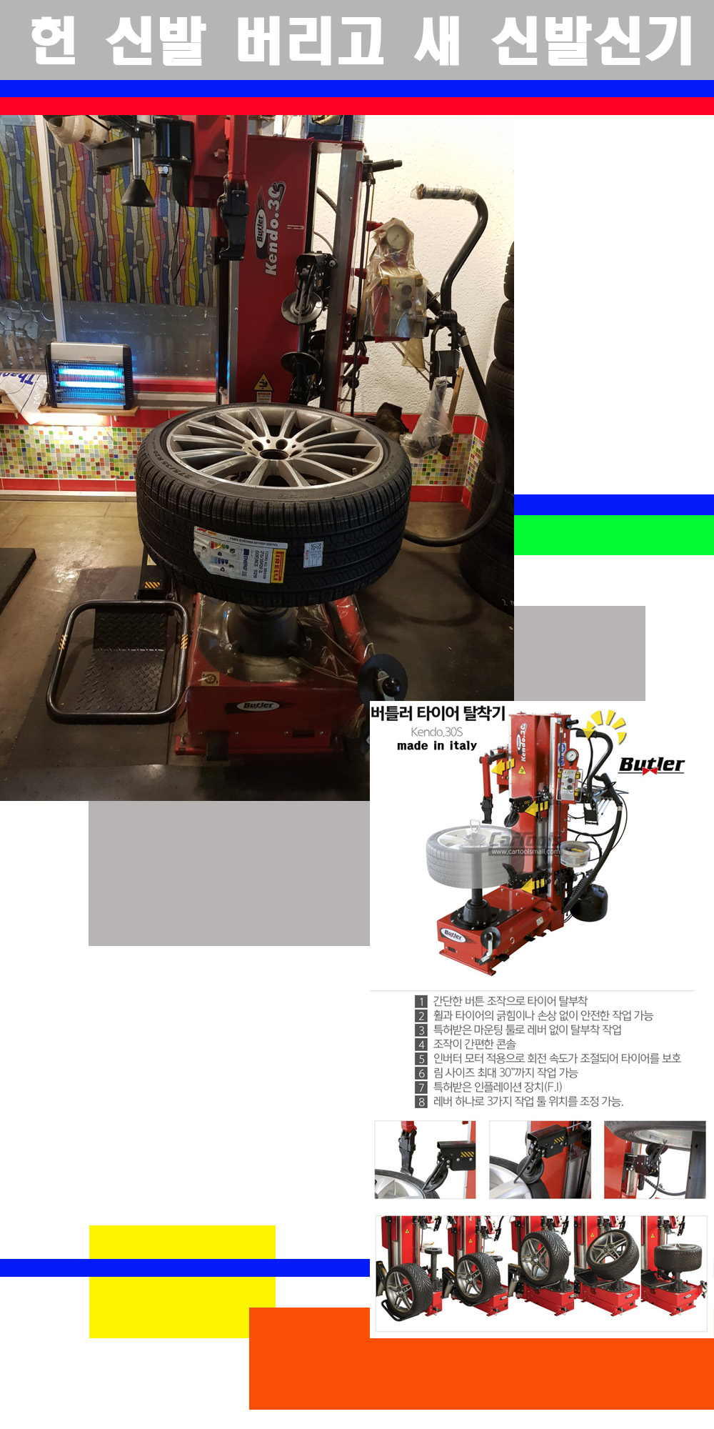이태리 버틀러사의 켄도3.0S는 휠과 타이어와 조립과 분리시 전혀 제품에 손상을 주지않는 탈착기로 특히 센터락방식(중앙에서 휠를 고정하는 방식)이여서 휠의 중앙부위 잡아서 타이어를 탈부착하고 이후 상하롤러로 타이어를 탈부착합니다 특히 유니포미티작업(휠의 가장가벼운부분과 타이어의 가장 무거운부분을 매칭시키는 작업)시 작업자가 타이어를 정확한 지점에 휠과 매칭시킬수 있는 장점도 있습니다 유니포미티작업 불량시 과도한 진동값으로 핸들링불안 승차감저하 과도한 노면의 충격흡수를 가져와 주행감성을 해치는 첫번째 이유입니다 하지만 이런 작업을 무시하고 그냥 정적인 휠발란스작업만 하는것이 현실입니다 보통 타이어가격만 생각하시고 장착을 하시는데 꼭 이런 부분까지 챙길수 있는 샵을 권장합니다