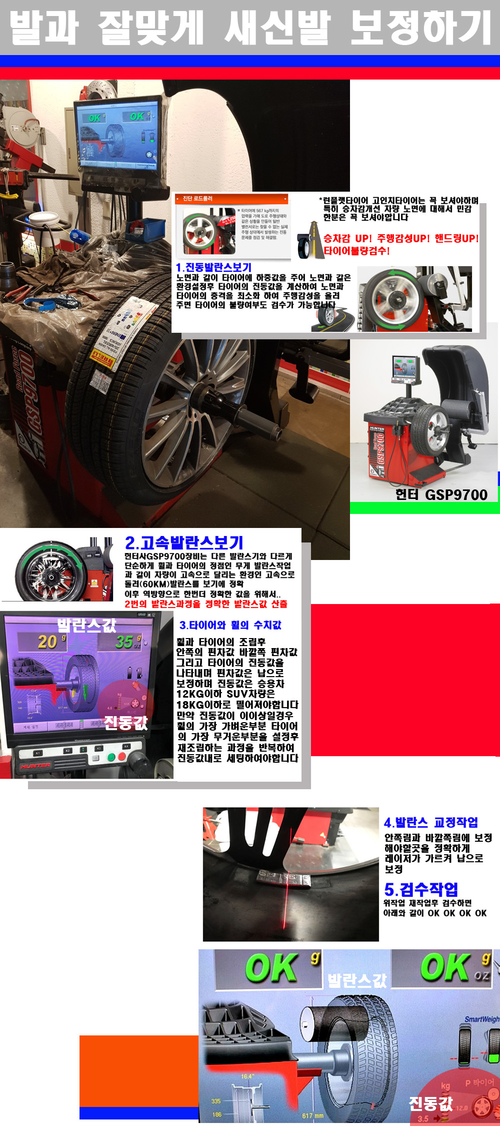 이후 미국 헌터사 GSP9700장비로 고속 및 진동발란스로 더욱더 작업의 정확도와 정밀도를 높였습니다 이장비는 노면에서 올라오는 진동값까지 계산하여 발란스값을 보는 방식으로 진동발란스기는 헌터사GSP9700장비가 유일합니다 이후 역방향으로 60키로의 고속으로 다시 발란스값을 보정하는 방식입니다 그래서 노면에서 올라오는 진동를 잡을수 있으며 특히 타이어의 노면력 측정으로 타이어의 불량여부까지도 검수가 가능한 장비입니다 특히 고속발란스 측정시 타사 발란스기와 틀리게 고속으로 발란스를 보기에 차량이 고속으로 달리는 시뮤레이션 구현이 가능하여 정확한 발란스값을 볼수가 있습니다 그리고 작업자에게는 불필요한 발란스납을 붙이지 않아 미관상으로 좋고 납을 절약하는 고객님에게도윈이고 작업자에게도 윈윈할수 있는 장비입니다 그리고 시중에서 고속진동발란스라고 말하시는 샵들이 많은데 꼭아셔야하는것은 고속발란스는 말그대로 발란스를 볼때 고속으로 돌리기에 60키로 전후 그리고 진동값을 계산하기위해서는 발란스기에 진동롤러가 있어야합니다 그래서 미국헌터사 GSP9700장비가 유일합니다