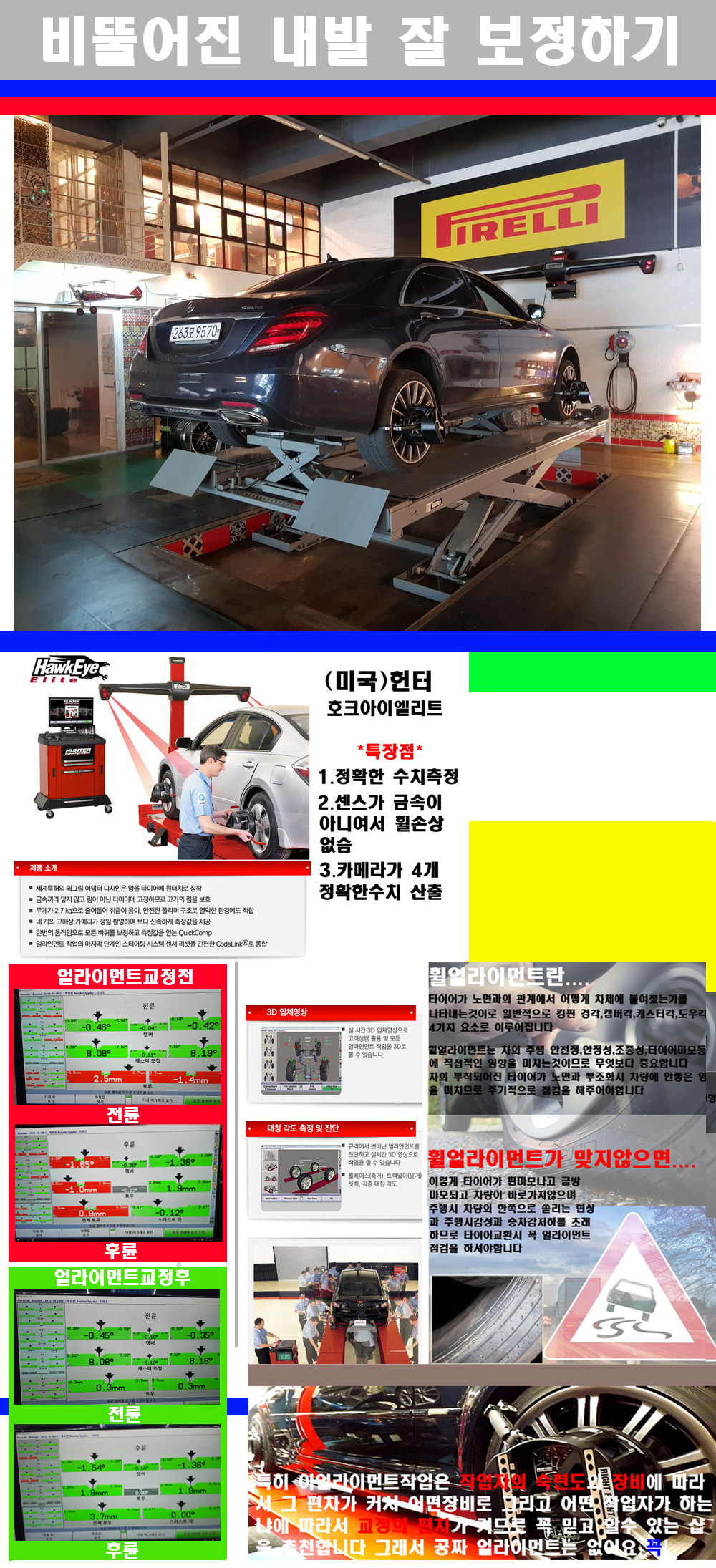 이후 미국 헌터사 호크아이엘리트 장비로 3D얼라이먼트를 진행했습니다 이장비는 현존하는 가장 진화된 얼라이먼트장비입니다 특히 4개의 고성능카메라가 장착되어져 있어 실시간으로 오차가 없는 측정값을 구현하며 바퀴당 각 휠센서 클램프가 프라스틱이며 타이어바닦면을 지지하는 방식이여서 휠의 손상이 없는것이 특징입니다 하지만 장비보다 차량의 얼라이먼트를 볼시 작업자의 정성과 그리고 능력과 숙련도가 관견이기에 꼭 휠얼라이먼트를 장사수단으로 하지않는 샵을 권장합니다 자사는 얼라이먼트정렬시 교정전 교정후를 구분하여 고객님께 직접 이수치값을 확인시켜드리고 작업을 하며 이후 각각의 특성을 가진 타이어들에 대해서 설명 및 관리요령 운전요령 같이 설명해드리고 있습니다 이후 타이어와 휠의 정확한 발란스값과 진동값을 보정후 헌터사 호크아이엘리트 3D얼라이먼트장비로 공장에서 처음 출고될시의 팩토리값으로 교정하였습니다 그리고 타이어질소가스주입기로 3번정도 진공상태로 만든후 질소가스를 주입했습니다 질소가스주입시 가장 관견은 순도이기에 이런 여러번의 진공상태후 주입하고 빼주는 과정를 많이 해주어야합니다 질소가스의 주입시 타이어공기압의 저하가 덜하고 화합물질이 반응을 하지않아 소음전파력과 그리고 타이어안쪽에 수분을 발생하지않으며 타이어안쪽에서의 공기압이 팽창하지않아 타이어에 스트레스를 덜주게 됩니다 하지만 이부분도 공기속에 질소가 80%정도 존재하기에 미미한 차이이지만 질소순도를 높이고 주행시 좋은 점이 확연히 많기에 질소주입을 해드리고 있습니다 특히 고성능타이어나 하중값을 많이 주는 타이어일경우에는 위에서 언급한 부분에서 많이 차이를 보이고 있습니다 이후 타이어왁싱후 출고했습니다+ 감사합니다 |