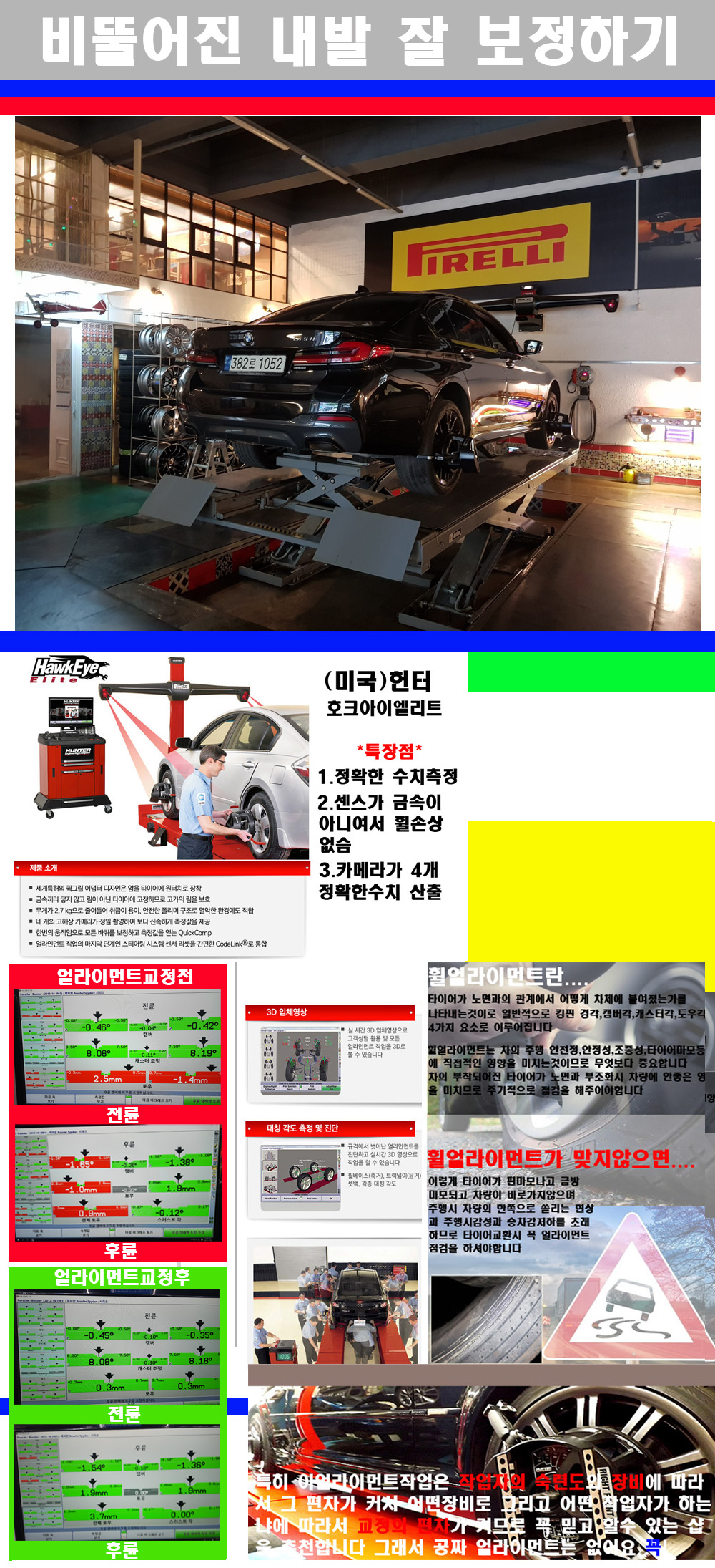 이후 미국 헌터사 호크아이엘리트 장비로 3D얼라이먼트를 진행했습니다 이장비는 현존하는 가장 진화된 얼라이먼트장비입니다 특히 4개의 고성능카메라가 장착되어져 있어 실시간으로 오차가 없는 측정값을 구현하며 바퀴당 각 휠센서 클램프가 프라스틱이며 타이어바닦면을 지지하는 방식이여서 휠의 손상이 없는것이 특징입니다 하지만 장비보다 차량의 얼라이먼트를 볼시 작업자의 정성과 그리고 능력과 숙련도가 관견이기에 꼭 휠얼라이먼트를 장사수단으로 하지않는 샵을 권장합니다 자사는 얼라이먼트정렬시 교정전 교정후를 구분하여 고객님께 직접 이수치값을 확인시켜드리고 작업을 하며 이후 각각의 특성을 가진 타이어들에 대해서 설명 및 관리요령 운전요령 같이 설명해드리고 있습니다 이후 타이어와 휠의 정확한 발란스값과 진동값을 보정후 헌터사 호크아이엘리트 3D얼라이먼트장비로 공장에서 처음 출고될시의 팩토리값으로 교정하였습니다 그리고 타이어질소가스주입기로 3번정도 진공상태로 만든후 질소가스를 주입했습니다 질소가스주입시 가장 관견은 순도이기에 이런 여러번의 진공상태후 주입하고 빼주는 과정를 많이 해주어야합니다 질소가스의 주입시 타이어공기압의 저하가 덜하고 화합물질이 반응을 하지않아 소음전파력과 그리고 타이어안쪽에 수분을 발생하지않으며 타이어안쪽에서의 공기압이 팽창하지않아 타이어에 스트레스를 덜주게 됩니다 하지만 이부분도 공기속에 질소가 80%정도 존재하기에 미미한 차이이지만 질소순도를 높이고 주행시 좋은 점이 확연히 많기에 질소주입을 해드리고 있습니다 특히 고성능타이어나 하중값을 많이 주는 타이어일경우에는 위에서 언급한 부분에서 많이 차이를 보이고 있습니다 이후 타이어왁싱후 출고했습니다+ 감사합니다 |