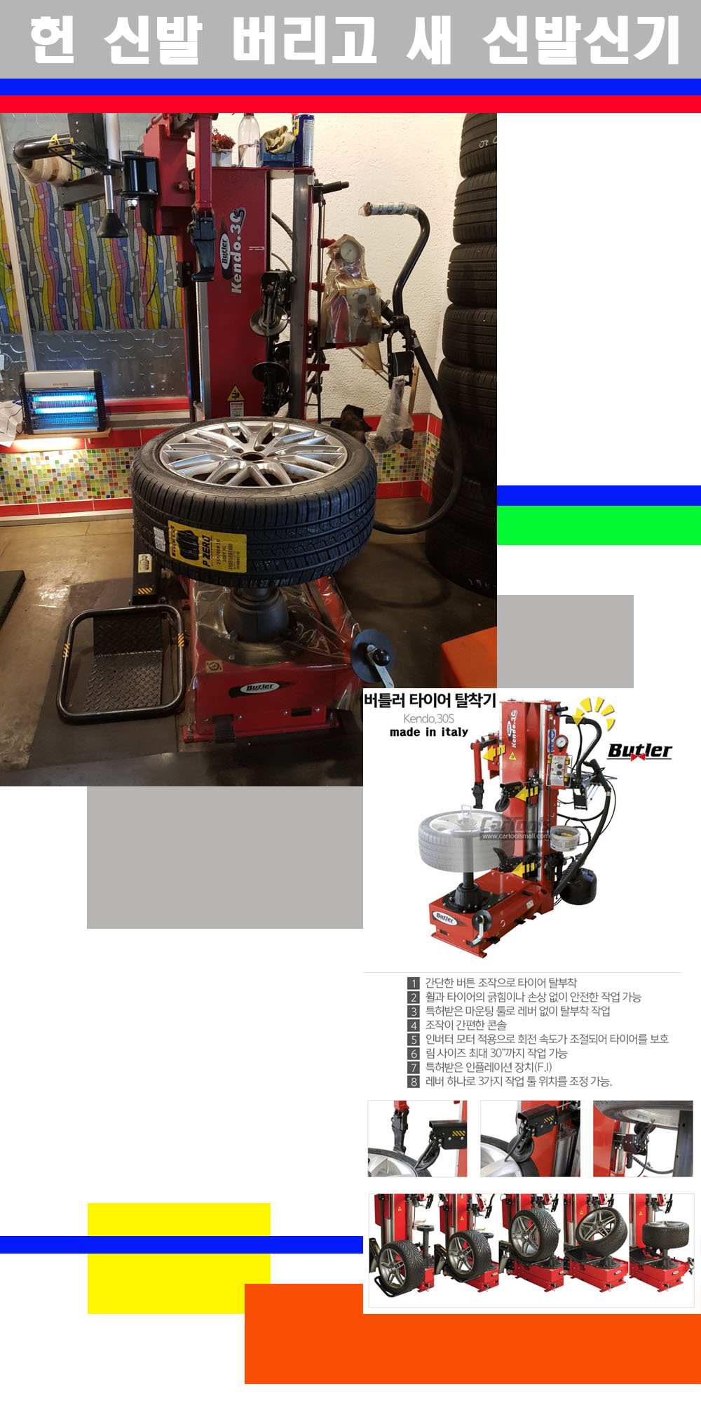 이태리 버틀러사의 켄도3.0S는 휠과 타이어와 조립과 분리시 전혀 제품에 손상을 주지않는 탈착기로 특히 센터락방식(중앙에서 휠를 고정하는 방식)이여서 휠의 중앙부위 잡아서 타이어를 탈부착하고 이후 상하롤러로 타이어를 탈부착합니다 특히 유니포미티작업(휠의 가장가벼운부분과 타이어의 가장 무거운부분을 매칭시키는 작업)시 작업자가 타이어를 정확한 지점에 휠과 매칭시킬수 있는 장점도 있습니다 유니포미티작업 불량시 과도한 진동값으로 핸들링불안 승차감저하 과도한 노면의 충격흡수를 가져와 주행감성을 해치는 첫번째 이유입니다 하지만 이런 작업을 무시하고 그냥 정적인 휠발란스작업만 하는것이 현실입니다 보통 타이어가격만 생각하시고 장착을 하시는데 꼭 이런 부분까지 챙길수 있는 샵을 권장합니다