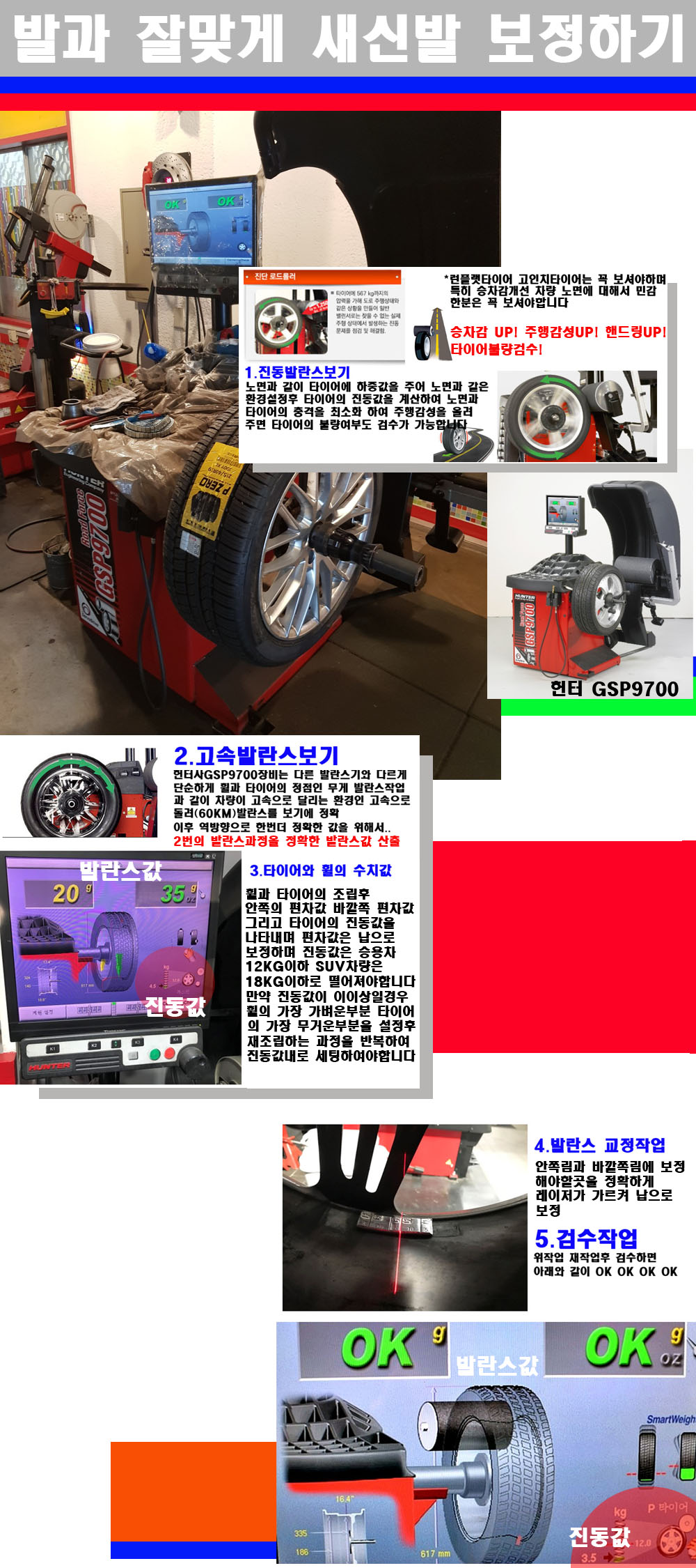 이후 미국 헌터사 GSP9700장비로 고속 및 진동발란스로 더욱더 작업의 정확도와 정밀도를 높였습니다 이장비는 노면에서 올라오는 진동값까지 계산하여 발란스값을 보는 방식으로 진동발란스기는 헌터사GSP9700장비가 유일합니다 이후 역방향으로 60키로의 고속으로 다시 발란스값을 보정하는 방식입니다 그래서 노면에서 올라오는 진동를 잡을수 있으며 특히 타이어의 노면력 측정으로 타이어의 불량여부까지도 검수가 가능한 장비입니다 특히 고속발란스 측정시 타사 발란스기와 틀리게 고속으로 발란스를 보기에 차량이 고속으로 달리는 시뮤레이션 구현이 가능하여 정확한 발란스값을 볼수가 있습니다 그리고 작업자에게는 불필요한 발란스납을 붙이지 않아 미관상으로 좋고 납을 절약하는 고객님에게도윈이고 작업자에게도 윈윈할수 있는 장비입니다 그리고 시중에서 고속진동발란스라고 말하시는 샵들이 많은데 꼭아셔야하는것은 고속발란스는 말그대로 발란스를 볼때 고속으로 돌리기에 60키로 전후 그리고 진동값을 계산하기위해서는 발란스기에 진동롤러가 있어야합니다 그래서 미국헌터사 GSP9700장비가 유일합니다