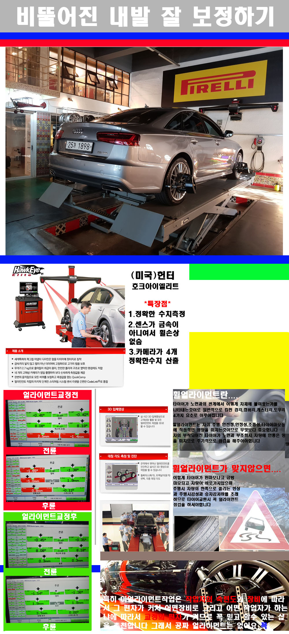 이후 미국 헌터사 호크아이엘리트 장비로 3D얼라이먼트를 진행했습니다 이장비는 현존하는 가장 진화된 얼라이먼트장비입니다 특히 4개의 고성능카메라가 장착되어져 있어 실시간으로 오차가 없는 측정값을 구현하며 바퀴당 각 휠센서 클램프가 프라스틱이며 타이어바닦면을 지지하는 방식이여서 휠의 손상이 없는것이 특징입니다 하지만 장비보다 차량의 얼라이먼트를 볼시 작업자의 정성과 그리고 능력과 숙련도가 관견이기에 꼭 휠얼라이먼트를 장사수단으로 하지않는 샵을 권장합니다 자사는 얼라이먼트정렬시 교정전 교정후를 구분하여 고객님께 직접 이수치값을 확인시켜드리고 작업을 하며 이후 각각의 특성을 가진 타이어들에 대해서 설명 및 관리요령 운전요령 같이 설명해드리고 있습니다 이후 타이어와 휠의 정확한 발란스값과 진동값을 보정후 헌터사 호크아이엘리트 3D얼라이먼트장비로 공장에서 처음 출고될시의 팩토리값으로 교정하였습니다 그리고 타이어질소가스주입기로 3번정도 진공상태로 만든후 질소가스를 주입했습니다 질소가스주입시 가장 관견은 순도이기에 이런 여러번의 진공상태후 주입하고 빼주는 과정를 많이 해주어야합니다 질소가스의 주입시 타이어공기압의 저하가 덜하고 화합물질이 반응을 하지않아 소음전파력과 그리고 타이어안쪽에 수분을 발생하지않으며 타이어안쪽에서의 공기압이 팽창하지않아 타이어에 스트레스를 덜주게 됩니다 하지만 이부분도 공기속에 질소가 80%정도 존재하기에 미미한 차이이지만 질소순도를 높이고 주행시 좋은 점이 확연히 많기에 질소주입을 해드리고 있습니다 특히 고성능타이어나 하중값을 많이 주는 타이어일경우에는 위에서 언급한 부분에서 많이 차이를 보이고 있습니다 이후 타이어왁싱후 출고했습니다+ 감사합니다 |