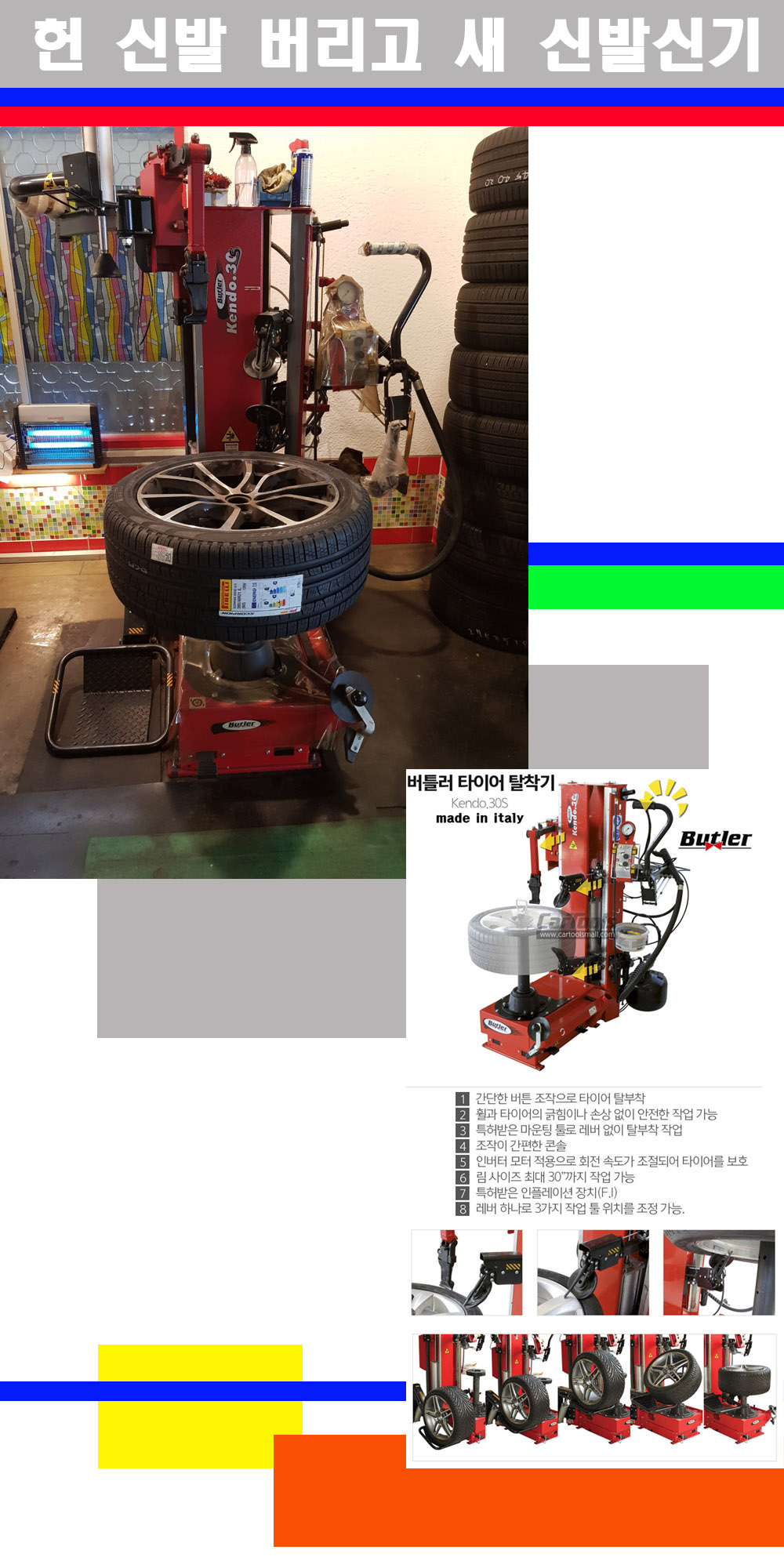 이태리 버틀러사의 켄도3.0S는 휠과 타이어와 조립과 분리시 전혀 제품에 손상을 주지않는 탈착기로 특히 센터락방식(중앙에서 휠를 고정하는 방식)이여서 휠의 중앙부위 잡아서 타이어를 탈부착하고 이후 상하롤러로 타이어를 탈부착합니다 특히 유니포미티작업(휠의 가장가벼운부분과 타이어의 가장 무거운부분을 매칭시키는 작업)시 작업자가 타이어를 정확한 지점에 휠과 매칭시킬수 있는 장점도 있습니다 유니포미티작업 불량시 과도한 진동값으로 핸들링불안 승차감저하 과도한 노면의 충격흡수를 가져와 주행감성을 해치는 첫번째 이유입니다 하지만 이런 작업을 무시하고 그냥 정적인 휠발란스작업만 하는것이 현실입니다 보통 타이어가격만 생각하시고 장착을 하시는데 꼭 이런 부분까지 챙길수 있는 샵을 권장합니다