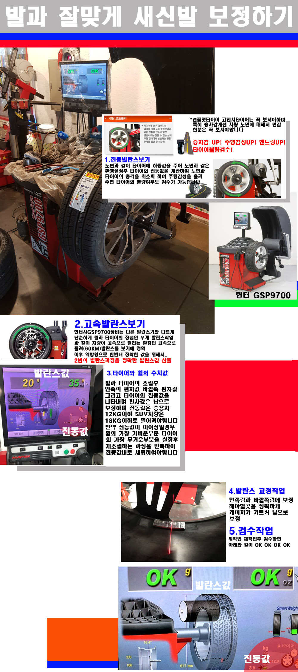 이후 미국 헌터사 GSP9700장비로 고속 및 진동발란스로 더욱더 작업의 정확도와 정밀도를 높였습니다 이장비는 노면에서 올라오는 진동값까지 계산하여 발란스값을 보는 방식으로 진동발란스기는 헌터사GSP9700장비가 유일합니다 이후 역방향으로 60키로의 고속으로 다시 발란스값을 보정하는 방식입니다 그래서 노면에서 올라오는 진동를 잡을수 있으며 특히 타이어의 노면력 측정으로 타이어의 불량여부까지도 검수가 가능한 장비입니다 특히 고속발란스 측정시 타사 발란스기와 틀리게 고속으로 발란스를 보기에 차량이 고속으로 달리는 시뮤레이션 구현이 가능하여 정확한 발란스값을 볼수가 있습니다 그리고 작업자에게는 불필요한 발란스납을 붙이지 않아 미관상으로 좋고 납을 절약하는 고객님에게도윈이고 작업자에게도 윈윈할수 있는 장비입니다 그리고 시중에서 고속진동발란스라고 말하시는 샵들이 많은데 꼭아셔야하는것은 고속발란스는 말그대로 발란스를 볼때 고속으로 돌리기에 60키로 전후 그리고 진동값을 계산하기위해서는 발란스기에 진동롤러가 있어야합니다 그래서 미국헌터사 GSP9700장비가 유일합니다
