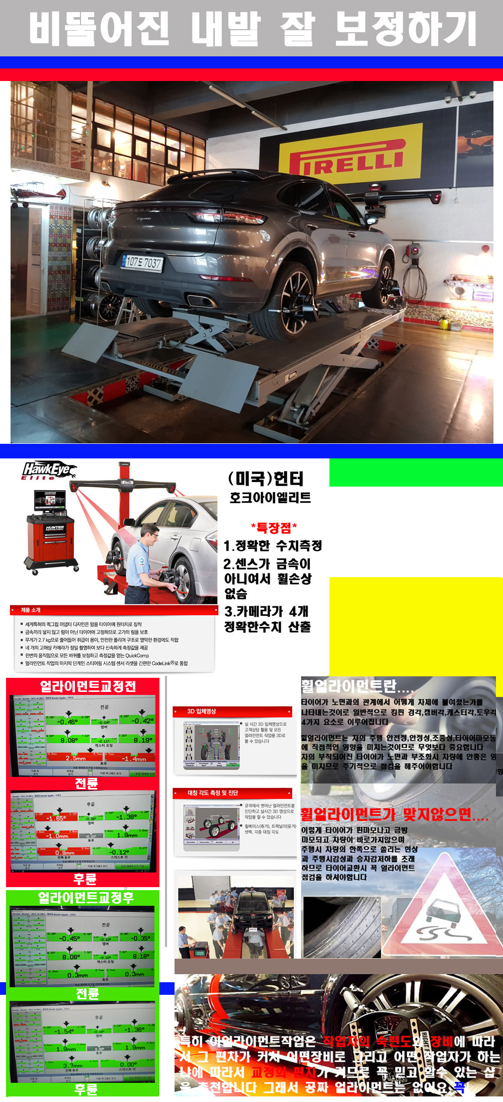 이후 미국 헌터사 호크아이엘리트 장비로 3D얼라이먼트를 진행했습니다 이장비는 현존하는 가장 진화된 얼라이먼트장비입니다 특히 4개의 고성능카메라가 장착되어져 있어 실시간으로 오차가 없는 측정값을 구현하며 바퀴당 각 휠센서 클램프가 프라스틱이며 타이어바닦면을 지지하는 방식이여서 휠의 손상이 없는것이 특징입니다 하지만 장비보다 차량의 얼라이먼트를 볼시 작업자의 정성과 그리고 능력과 숙련도가 관견이기에 꼭 휠얼라이먼트를 장사수단으로 하지않는 샵을 권장합니다 자사는 얼라이먼트정렬시 교정전 교정후를 구분하여 고객님께 직접 이수치값을 확인시켜드리고 작업을 하며 이후 각각의 특성을 가진 타이어들에 대해서 설명 및 관리요령 운전요령 같이 설명해드리고 있습니다 이후 타이어와 휠의 정확한 발란스값과 진동값을 보정후 헌터사 호크아이엘리트 3D얼라이먼트장비로 공장에서 처음 출고될시의 팩토리값으로 교정하였습니다 그리고 타이어질소가스주입기로 3번정도 진공상태로 만든후 질소가스를 주입했습니다 질소가스주입시 가장 관견은 순도이기에 이런 여러번의 진공상태후 주입하고 빼주는 과정를 많이 해주어야합니다 질소가스의 주입시 타이어공기압의 저하가 덜하고 화합물질이 반응을 하지않아 소음전파력과 그리고 타이어안쪽에 수분을 발생하지않으며 타이어안쪽에서의 공기압이 팽창하지않아 타이어에 스트레스를 덜주게 됩니다 하지만 이부분도 공기속에 질소가 80%정도 존재하기에 미미한 차이이지만 질소순도를 높이고 주행시 좋은 점이 확연히 많기에 질소주입을 해드리고 있습니다 특히 고성능타이어나 하중값을 많이 주는 타이어일경우에는 위에서 언급한 부분에서 많이 차이를 보이고 있습니다 이후 타이어왁싱후 출고했습니다+ 감사합니다 |