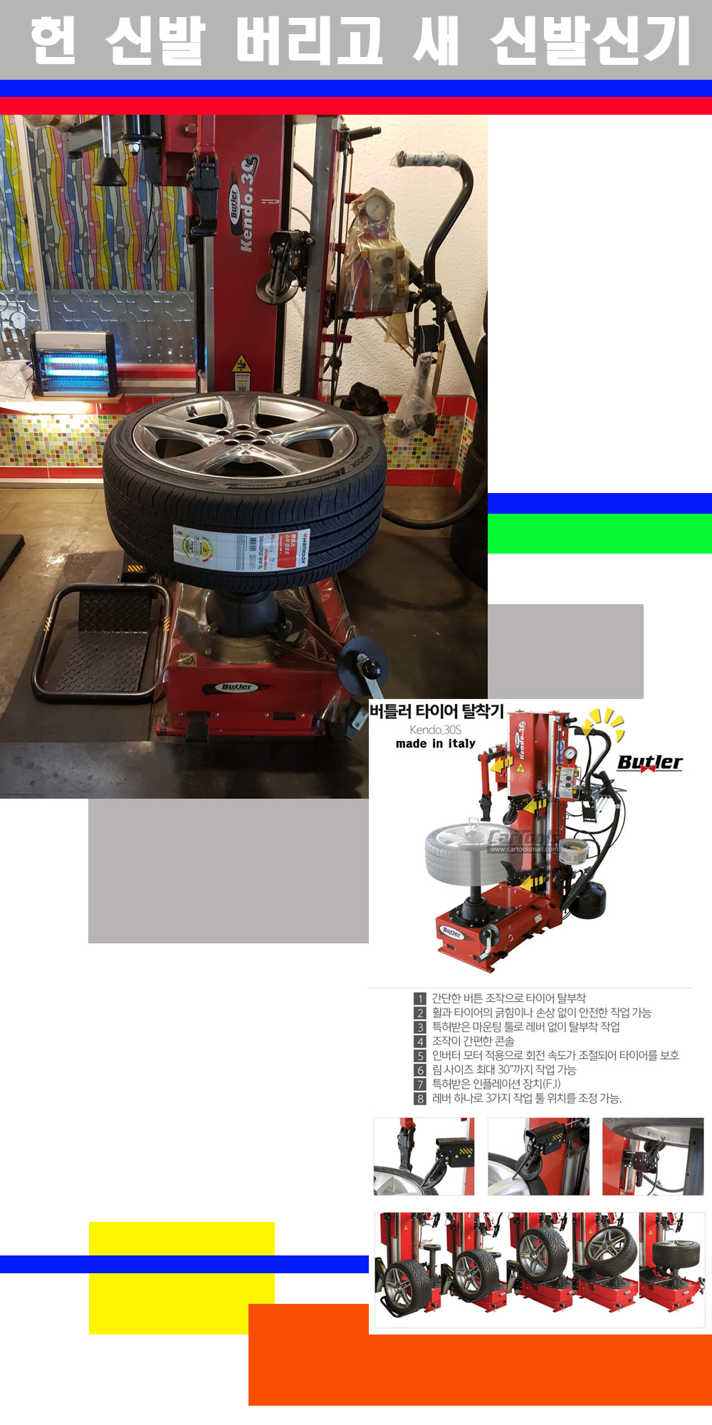 이태리 버틀러사의 켄도3.0S는 휠과 타이어와 조립과 분리시 전혀 제품에 손상을 주지않는 탈착기로 특히 센터락방식(중앙에서 휠를 고정하는 방식)이여서 휠의 중앙부위 잡아서 타이어를 탈부착하고 이후 상하롤러로 타이어를 탈부착합니다 특히 유니포미티작업(휠의 가장가벼운부분과 타이어의 가장 무거운부분을 매칭시키는 작업)시 작업자가 타이어를 정확한 지점에 휠과 매칭시킬수 있는 장점도 있습니다 유니포미티작업 불량시 과도한 진동값으로 핸들링불안 승차감저하 과도한 노면의 충격흡수를 가져와 주행감성을 해치는 첫번째 이유입니다 하지만 이런 작업을 무시하고 그냥 정적인 휠발란스작업만 하는것이 현실입니다 보통 타이어가격만 생각하시고 장착을 하시는데 꼭 이런 부분까지 챙길수 있는 샵을 권장합니다