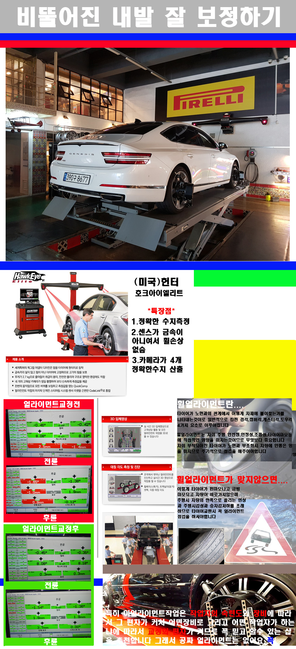 이후 미국 헌터사 호크아이엘리트 장비로 3D얼라이먼트를 진행했습니다 이장비는 현존하는 가장 진화된 얼라이먼트장비입니다 특히 4개의 고성능카메라가 장착되어져 있어 실시간으로 오차가 없는 측정값을 구현하며 바퀴당 각 휠센서 클램프가 프라스틱이며 타이어바닦면을 지지하는 방식이여서 휠의 손상이 없는것이 특징입니다 하지만 장비보다 차량의 얼라이먼트를 볼시 작업자의 정성과 그리고 능력과 숙련도가 관견이기에 꼭 휠얼라이먼트를 장사수단으로 하지않는 샵을 권장합니다 자사는 얼라이먼트정렬시 교정전 교정후를 구분하여 고객님께 직접 이수치값을 확인시켜드리고 작업을 하며 이후 각각의 특성을 가진 타이어들에 대해서 설명 및 관리요령 운전요령 같이 설명해드리고 있습니다 이후 타이어와 휠의 정확한 발란스값과 진동값을 보정후 헌터사 호크아이엘리트 3D얼라이먼트장비로 공장에서 처음 출고될시의 팩토리값으로 교정하였습니다 그리고 타이어질소가스주입기로 3번정도 진공상태로 만든후 질소가스를 주입했습니다 질소가스주입시 가장 관견은 순도이기에 이런 여러번의 진공상태후 주입하고 빼주는 과정를 많이 해주어야합니다 질소가스의 주입시 타이어공기압의 저하가 덜하고 화합물질이 반응을 하지않아 소음전파력과 그리고 타이어안쪽에 수분을 발생하지않으며 타이어안쪽에서의 공기압이 팽창하지않아 타이어에 스트레스를 덜주게 됩니다 하지만 이부분도 공기속에 질소가 80%정도 존재하기에 미미한 차이이지만 질소순도를 높이고 주행시 좋은 점이 확연히 많기에 질소주입을 해드리고 있습니다 특히 고성능타이어나 하중값을 많이 주는 타이어일경우에는 위에서 언급한 부분에서 많이 차이를 보이고 있습니다 이후 타이어왁싱후 출고했습니다+ 감사합니다 |