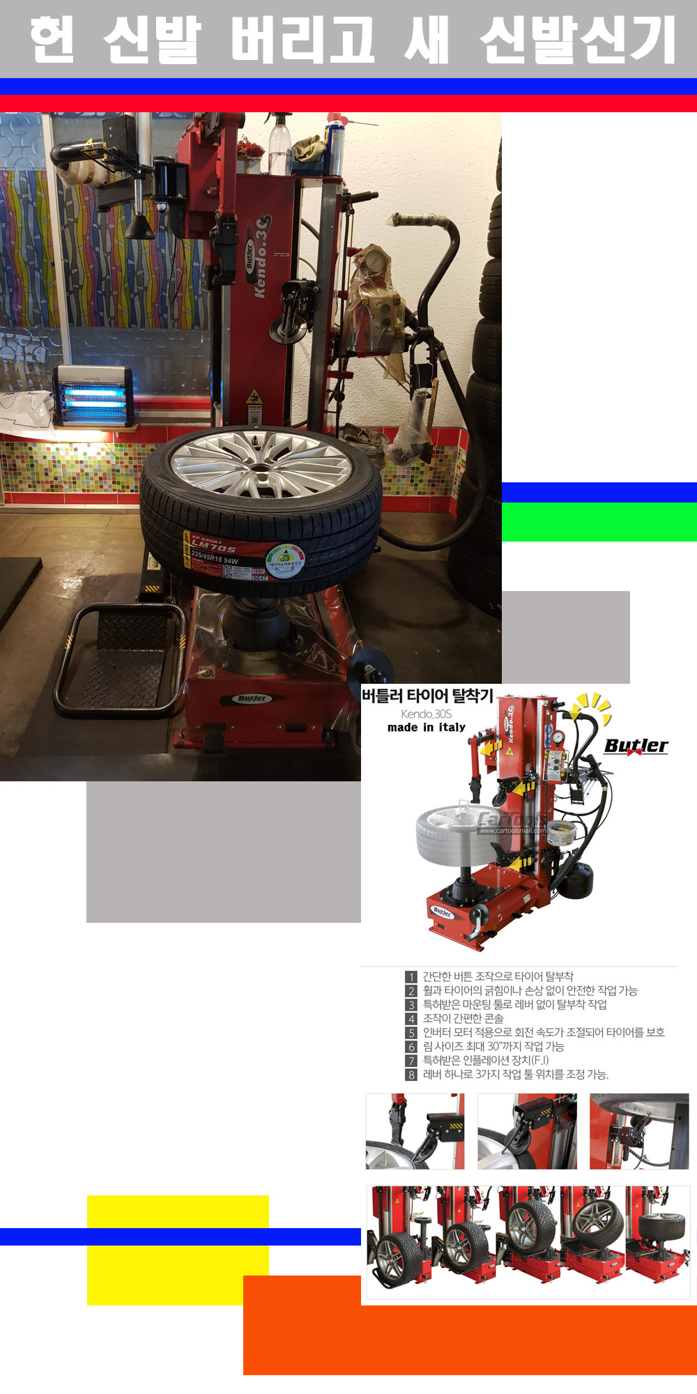 이태리 버틀러사의 켄도3.0S는 휠과 타이어와 조립과 분리시 전혀 제품에 손상을 주지않는 탈착기로 특히 센터락방식(중앙에서 휠를 고정하는 방식)이여서 휠의 중앙부위 잡아서 타이어를 탈부착하고 이후 상하롤러로 타이어를 탈부착합니다 특히 유니포미티작업(휠의 가장가벼운부분과 타이어의 가장 무거운부분을 매칭시키는 작업)시 작업자가 타이어를 정확한 지점에 휠과 매칭시킬수 있는 장점도 있습니다 유니포미티작업 불량시 과도한 진동값으로 핸들링불안 승차감저하 과도한 노면의 충격흡수를 가져와 주행감성을 해치는 첫번째 이유입니다 하지만 이런 작업을 무시하고 그냥 정적인 휠발란스작업만 하는것이 현실입니다 보통 타이어가격만 생각하시고 장착을 하시는데 꼭 이런 부분까지 챙길수 있는 샵을 권장합니다