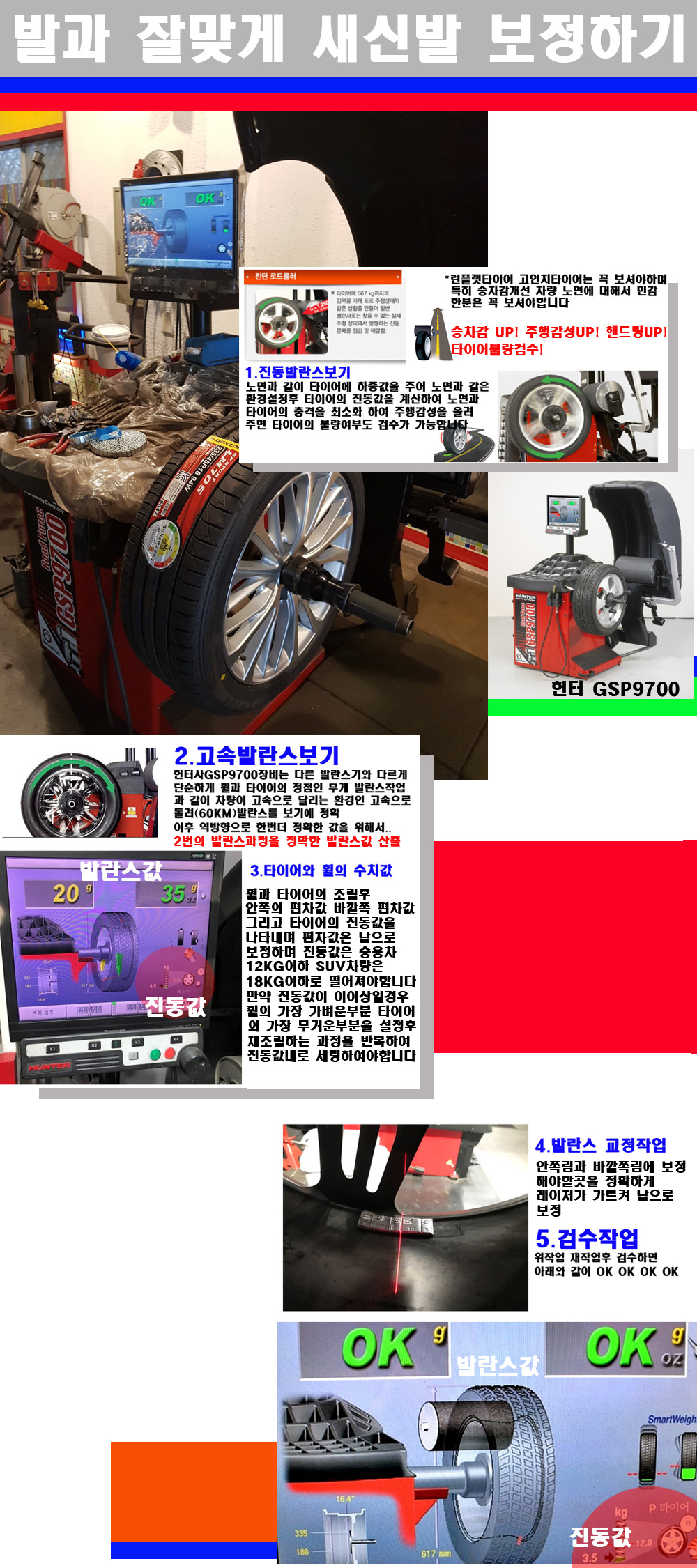 이후 미국 헌터사 GSP9700장비로 고속 및 진동발란스로 더욱더 작업의 정확도와 정밀도를 높였습니다 이장비는 노면에서 올라오는 진동값까지 계산하여 발란스값을 보는 방식으로 진동발란스기는 헌터사GSP9700장비가 유일합니다 이후 역방향으로 60키로의 고속으로 다시 발란스값을 보정하는 방식입니다 그래서 노면에서 올라오는 진동를 잡을수 있으며 특히 타이어의 노면력 측정으로 타이어의 불량여부까지도 검수가 가능한 장비입니다 특히 고속발란스 측정시 타사 발란스기와 틀리게 고속으로 발란스를 보기에 차량이 고속으로 달리는 시뮤레이션 구현이 가능하여 정확한 발란스값을 볼수가 있습니다 그리고 작업자에게는 불필요한 발란스납을 붙이지 않아 미관상으로 좋고 납을 절약하는 고객님에게도윈이고 작업자에게도 윈윈할수 있는 장비입니다 그리고 시중에서 고속진동발란스라고 말하시는 샵들이 많은데 꼭아셔야하는것은 고속발란스는 말그대로 발란스를 볼때 고속으로 돌리기에 60키로 전후 그리고 진동값을 계산하기위해서는 발란스기에 진동롤러가 있어야합니다 그래서 미국헌터사 GSP9700장비가 유일합니다