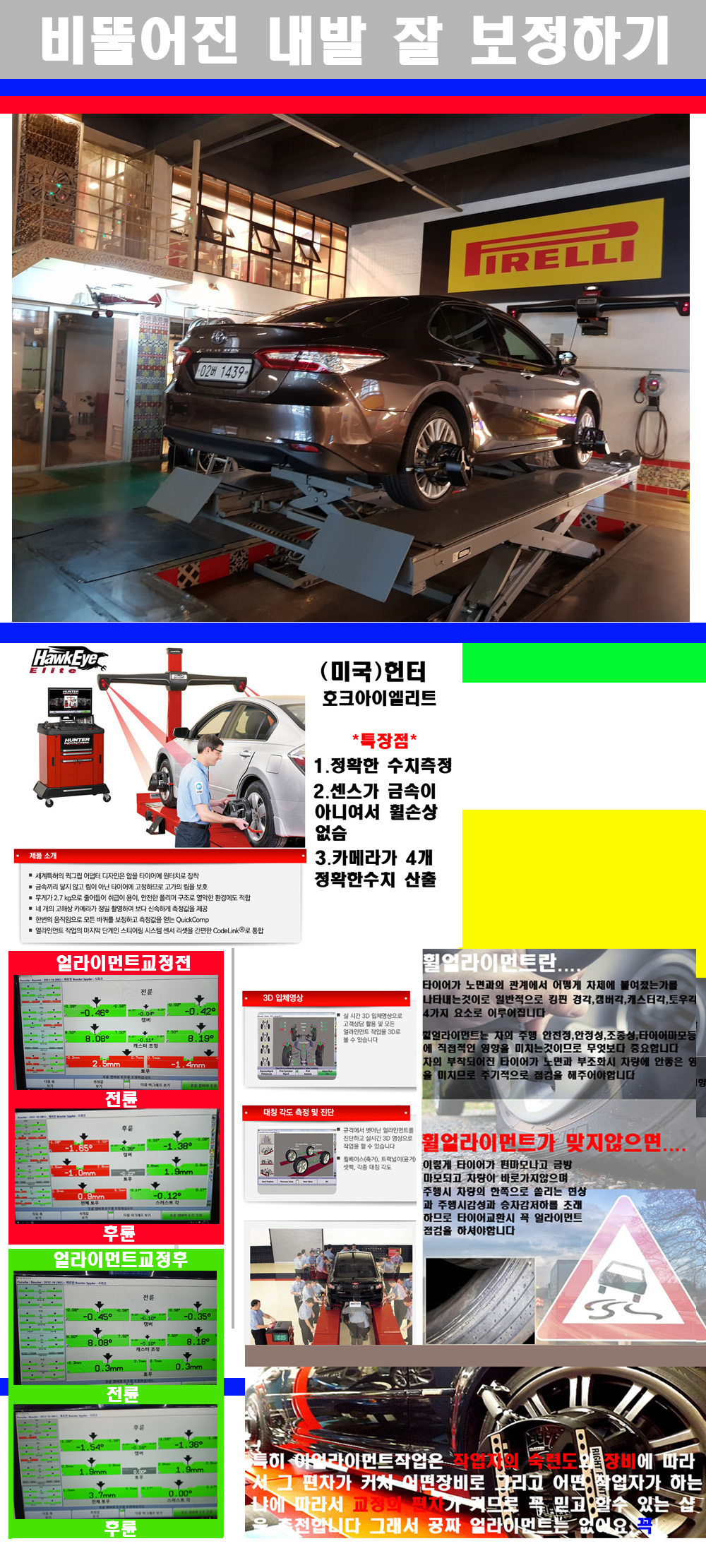 이후 미국 헌터사 호크아이엘리트 장비로 3D얼라이먼트를 진행했습니다 이장비는 현존하는 가장 진화된 얼라이먼트장비입니다 특히 4개의 고성능카메라가 장착되어져 있어 실시간으로 오차가 없는 측정값을 구현하며 바퀴당 각 휠센서 클램프가 프라스틱이며 타이어바닦면을 지지하는 방식이여서 휠의 손상이 없는것이 특징입니다 하지만 장비보다 차량의 얼라이먼트를 볼시 작업자의 정성과 그리고 능력과 숙련도가 관견이기에 꼭 휠얼라이먼트를 장사수단으로 하지않는 샵을 권장합니다 자사는 얼라이먼트정렬시 교정전 교정후를 구분하여 고객님께 직접 이수치값을 확인시켜드리고 작업을 하며 이후 각각의 특성을 가진 타이어들에 대해서 설명 및 관리요령 운전요령 같이 설명해드리고 있습니다 이후 타이어와 휠의 정확한 발란스값과 진동값을 보정후 헌터사 호크아이엘리트 3D얼라이먼트장비로 공장에서 처음 출고될시의 팩토리값으로 교정하였습니다 그리고 타이어질소가스주입기로 3번정도 진공상태로 만든후 질소가스를 주입했습니다 질소가스주입시 가장 관견은 순도이기에 이런 여러번의 진공상태후 주입하고 빼주는 과정를 많이 해주어야합니다 질소가스의 주입시 타이어공기압의 저하가 덜하고 화합물질이 반응을 하지않아 소음전파력과 그리고 타이어안쪽에 수분을 발생하지않으며 타이어안쪽에서의 공기압이 팽창하지않아 타이어에 스트레스를 덜주게 됩니다 하지만 이부분도 공기속에 질소가 80%정도 존재하기에 미미한 차이이지만 질소순도를 높이고 주행시 좋은 점이 확연히 많기에 질소주입을 해드리고 있습니다 특히 고성능타이어나 하중값을 많이 주는 타이어일경우에는 위에서 언급한 부분에서 많이 차이를 보이고 있습니다 이후 타이어왁싱후 출고했습니다+ 감사합니다 |