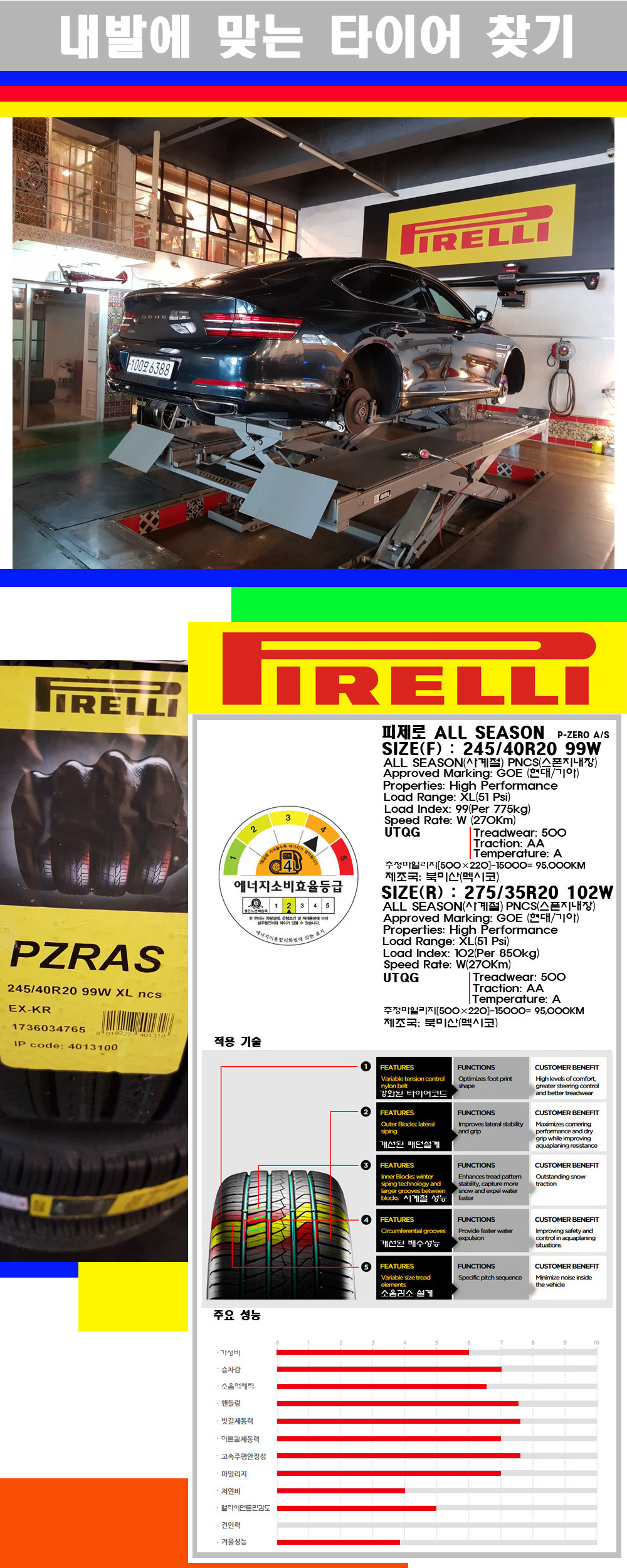 | [대구피렐리타이어싼곳] [제네시스G80타이어] 2454020 2753520 피렐리타이어 피제로올시즌(스폰지내장) 전륜)245 40 20 후륜)275 35 20 | |||