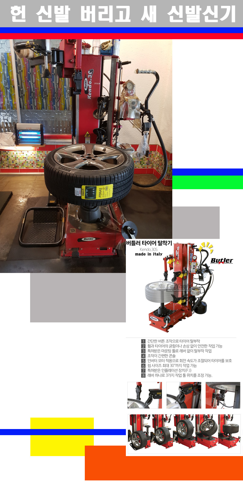 이태리 버틀러사의 켄도3.0S는 휠과 타이어와 조립과 분리시 전혀 제품에 손상을 주지않는 탈착기로 특히 센터락방식(중앙에서 휠를 고정하는 방식)이여서 휠의 중앙부위 잡아서 타이어를 탈부착하고 이후 상하롤러로 타이어를 탈부착합니다 특히 유니포미티작업(휠의 가장가벼운부분과 타이어의 가장 무거운부분을 매칭시키는 작업)시 작업자가 타이어를 정확한 지점에 휠과 매칭시킬수 있는 장점도 있습니다 유니포미티작업 불량시 과도한 진동값으로 핸들링불안 승차감저하 과도한 노면의 충격흡수를 가져와 주행감성을 해치는 첫번째 이유입니다 하지만 이런 작업을 무시하고 그냥 정적인 휠발란스작업만 하는것이 현실입니다 보통 타이어가격만 생각하시고 장착을 하시는데 꼭 이런 부분까지 챙길수 있는 샵을 권장합니다
