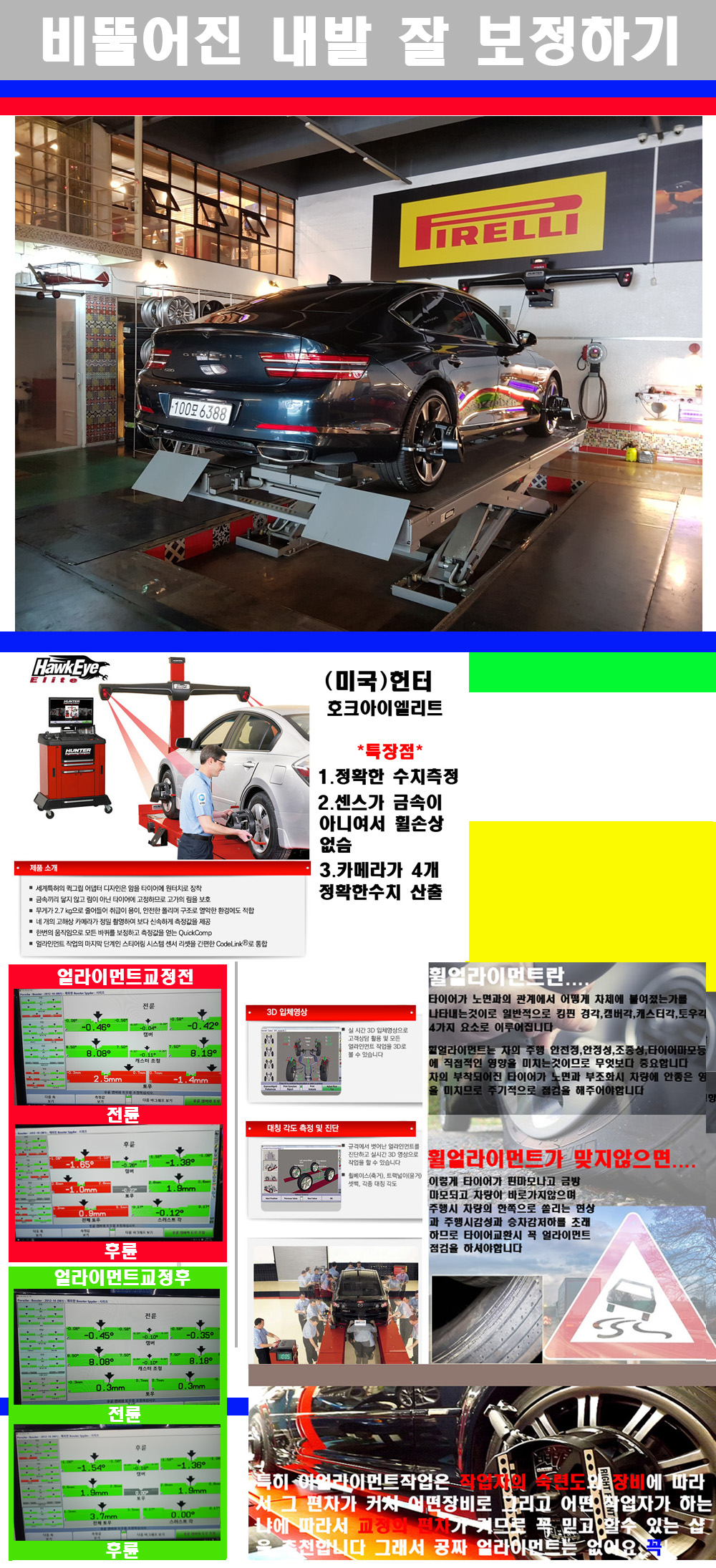 이후 미국 헌터사 호크아이엘리트 장비로 3D얼라이먼트를 진행했습니다 이장비는 현존하는 가장 진화된 얼라이먼트장비입니다 특히 4개의 고성능카메라가 장착되어져 있어 실시간으로 오차가 없는 측정값을 구현하며 바퀴당 각 휠센서 클램프가 프라스틱이며 타이어바닦면을 지지하는 방식이여서 휠의 손상이 없는것이 특징입니다 하지만 장비보다 차량의 얼라이먼트를 볼시 작업자의 정성과 그리고 능력과 숙련도가 관견이기에 꼭 휠얼라이먼트를 장사수단으로 하지않는 샵을 권장합니다 자사는 얼라이먼트정렬시 교정전 교정후를 구분하여 고객님께 직접 이수치값을 확인시켜드리고 작업을 하며 이후 각각의 특성을 가진 타이어들에 대해서 설명 및 관리요령 운전요령 같이 설명해드리고 있습니다 이후 타이어와 휠의 정확한 발란스값과 진동값을 보정후 헌터사 호크아이엘리트 3D얼라이먼트장비로 공장에서 처음 출고될시의 팩토리값으로 교정하였습니다 그리고 타이어질소가스주입기로 3번정도 진공상태로 만든후 질소가스를 주입했습니다 질소가스주입시 가장 관견은 순도이기에 이런 여러번의 진공상태후 주입하고 빼주는 과정를 많이 해주어야합니다 질소가스의 주입시 타이어공기압의 저하가 덜하고 화합물질이 반응을 하지않아 소음전파력과 그리고 타이어안쪽에 수분을 발생하지않으며 타이어안쪽에서의 공기압이 팽창하지않아 타이어에 스트레스를 덜주게 됩니다 하지만 이부분도 공기속에 질소가 80%정도 존재하기에 미미한 차이이지만 질소순도를 높이고 주행시 좋은 점이 확연히 많기에 질소주입을 해드리고 있습니다 특히 고성능타이어나 하중값을 많이 주는 타이어일경우에는 위에서 언급한 부분에서 많이 차이를 보이고 있습니다 이후 타이어왁싱후 출고했습니다+ 감사합니다 |