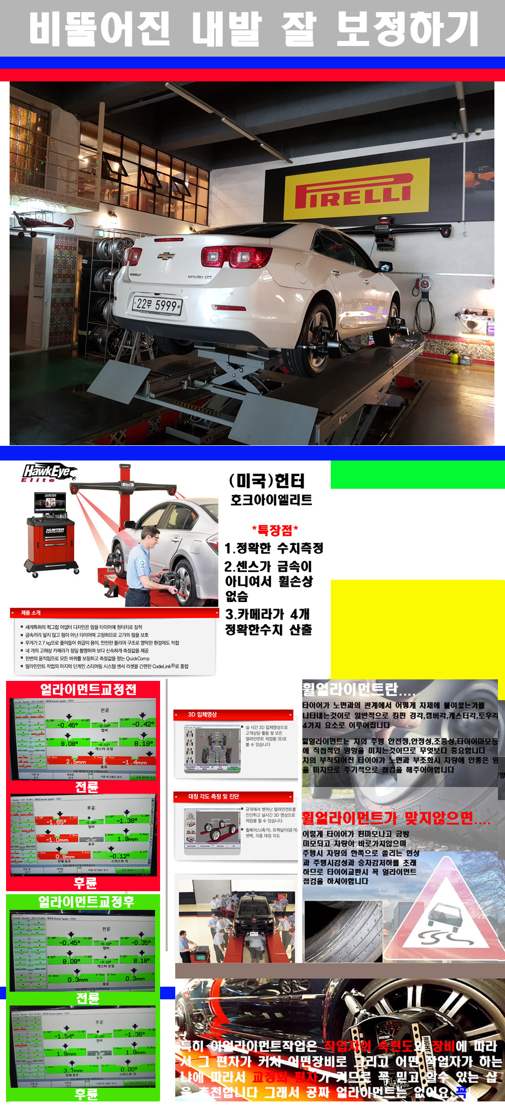 이후 미국 헌터사 호크아이엘리트 장비로 3D얼라이먼트를 진행했습니다 이장비는 현존하는 가장 진화된 얼라이먼트장비입니다 특히 4개의 고성능카메라가 장착되어져 있어 실시간으로 오차가 없는 측정값을 구현하며 바퀴당 각 휠센서 클램프가 프라스틱이며 타이어바닦면을 지지하는 방식이여서 휠의 손상이 없는것이 특징입니다 하지만 장비보다 차량의 얼라이먼트를 볼시 작업자의 정성과 그리고 능력과 숙련도가 관견이기에 꼭 휠얼라이먼트를 장사수단으로 하지않는 샵을 권장합니다 자사는 얼라이먼트정렬시 교정전 교정후를 구분하여 고객님께 직접 이수치값을 확인시켜드리고 작업을 하며 이후 각각의 특성을 가진 타이어들에 대해서 설명 및 관리요령 운전요령 같이 설명해드리고 있습니다 이후 타이어와 휠의 정확한 발란스값과 진동값을 보정후 헌터사 호크아이엘리트 3D얼라이먼트장비로 공장에서 처음 출고될시의 팩토리값으로 교정하였습니다 그리고 타이어질소가스주입기로 3번정도 진공상태로 만든후 질소가스를 주입했습니다 질소가스주입시 가장 관견은 순도이기에 이런 여러번의 진공상태후 주입하고 빼주는 과정를 많이 해주어야합니다 질소가스의 주입시 타이어공기압의 저하가 덜하고 화합물질이 반응을 하지않아 소음전파력과 그리고 타이어안쪽에 수분을 발생하지않으며 타이어안쪽에서의 공기압이 팽창하지않아 타이어에 스트레스를 덜주게 됩니다 하지만 이부분도 공기속에 질소가 80%정도 존재하기에 미미한 차이이지만 질소순도를 높이고 주행시 좋은 점이 확연히 많기에 질소주입을 해드리고 있습니다 특히 고성능타이어나 하중값을 많이 주는 타이어일경우에는 위에서 언급한 부분에서 많이 차이를 보이고 있습니다 이후 타이어왁싱후 출고했습니다+ 감사합니다 |