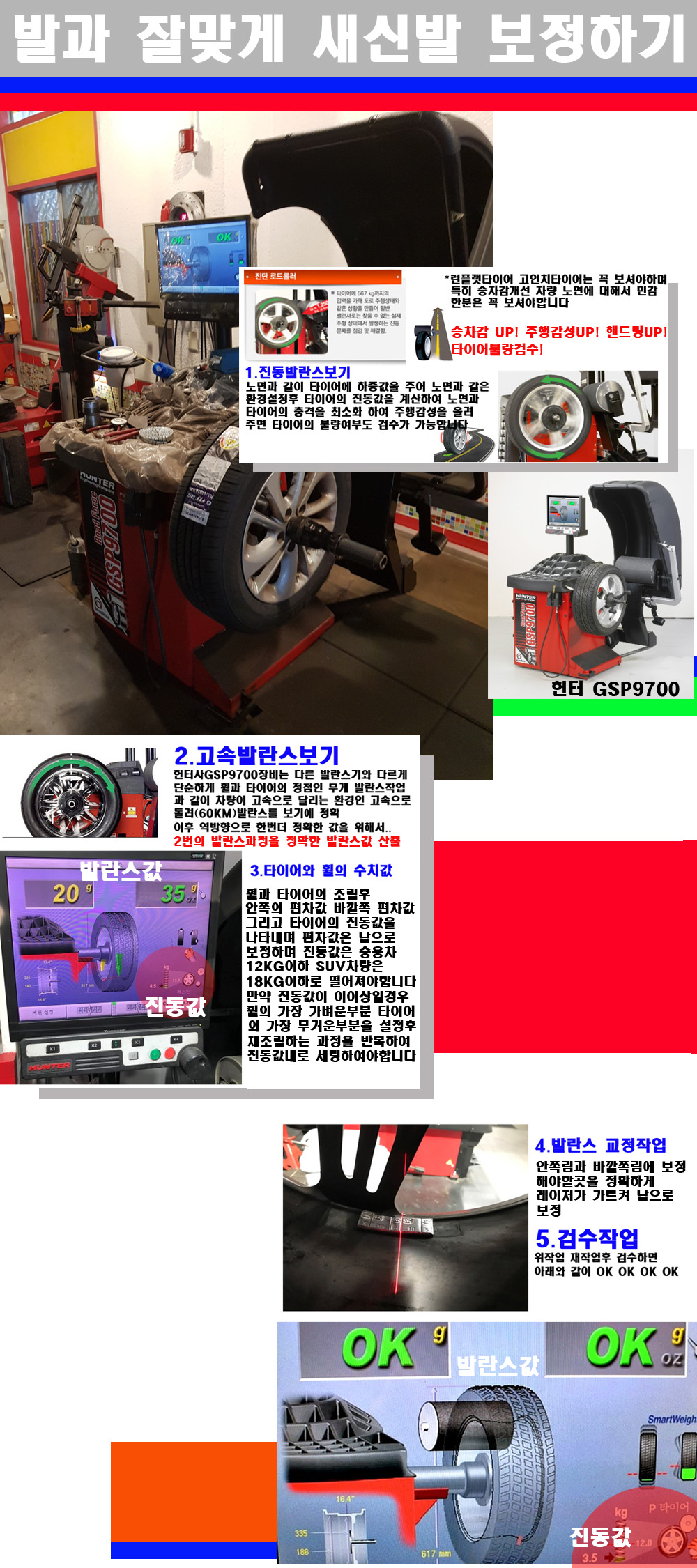 이후 미국 헌터사 GSP9700장비로 고속 및 진동발란스로 더욱더 작업의 정확도와 정밀도를 높였습니다 이장비는 노면에서 올라오는 진동값까지 계산하여 발란스값을 보는 방식으로 진동발란스기는 헌터사GSP9700장비가 유일합니다 이후 역방향으로 60키로의 고속으로 다시 발란스값을 보정하는 방식입니다 그래서 노면에서 올라오는 진동를 잡을수 있으며 특히 타이어의 노면력 측정으로 타이어의 불량여부까지도 검수가 가능한 장비입니다 특히 고속발란스 측정시 타사 발란스기와 틀리게 고속으로 발란스를 보기에 차량이 고속으로 달리는 시뮤레이션 구현이 가능하여 정확한 발란스값을 볼수가 있습니다 그리고 작업자에게는 불필요한 발란스납을 붙이지 않아 미관상으로 좋고 납을 절약하는 고객님에게도윈이고 작업자에게도 윈윈할수 있는 장비입니다 그리고 시중에서 고속진동발란스라고 말하시는 샵들이 많은데 꼭아셔야하는것은 고속발란스는 말그대로 발란스를 볼때 고속으로 돌리기에 60키로 전후 그리고 진동값을 계산하기위해서는 발란스기에 진동롤러가 있어야합니다 그래서 미국헌터사 GSP9700장비가 유일합니다