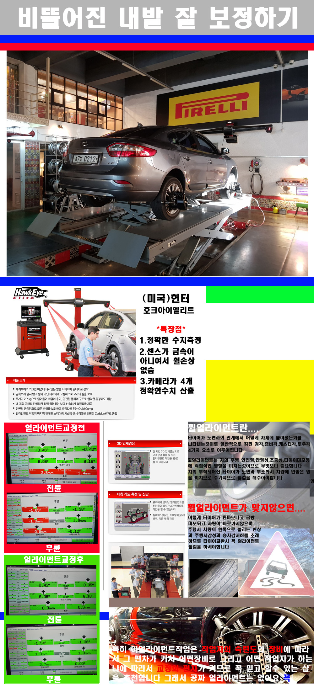 이후 미국 헌터사 호크아이엘리트 장비로 3D얼라이먼트를 진행했습니다 이장비는 현존하는 가장 진화된 얼라이먼트장비입니다 특히 4개의 고성능카메라가 장착되어져 있어 실시간으로 오차가 없는 측정값을 구현하며 바퀴당 각 휠센서 클램프가 프라스틱이며 타이어바닦면을 지지하는 방식이여서 휠의 손상이 없는것이 특징입니다 하지만 장비보다 차량의 얼라이먼트를 볼시 작업자의 정성과 그리고 능력과 숙련도가 관견이기에 꼭 휠얼라이먼트를 장사수단으로 하지않는 샵을 권장합니다 자사는 얼라이먼트정렬시 교정전 교정후를 구분하여 고객님께 직접 이수치값을 확인시켜드리고 작업을 하며 이후 각각의 특성을 가진 타이어들에 대해서 설명 및 관리요령 운전요령 같이 설명해드리고 있습니다 이후 타이어와 휠의 정확한 발란스값과 진동값을 보정후 헌터사 호크아이엘리트 3D얼라이먼트장비로 공장에서 처음 출고될시의 팩토리값으로 교정하였습니다 그리고 타이어질소가스주입기로 3번정도 진공상태로 만든후 질소가스를 주입했습니다 질소가스주입시 가장 관견은 순도이기에 이런 여러번의 진공상태후 주입하고 빼주는 과정를 많이 해주어야합니다 질소가스의 주입시 타이어공기압의 저하가 덜하고 화합물질이 반응을 하지않아 소음전파력과 그리고 타이어안쪽에 수분을 발생하지않으며 타이어안쪽에서의 공기압이 팽창하지않아 타이어에 스트레스를 덜주게 됩니다 하지만 이부분도 공기속에 질소가 80%정도 존재하기에 미미한 차이이지만 질소순도를 높이고 주행시 좋은 점이 확연히 많기에 질소주입을 해드리고 있습니다 특히 고성능타이어나 하중값을 많이 주는 타이어일경우에는 위에서 언급한 부분에서 많이 차이를 보이고 있습니다 이후 타이어왁싱후 출고했습니다+ 감사합니다 |