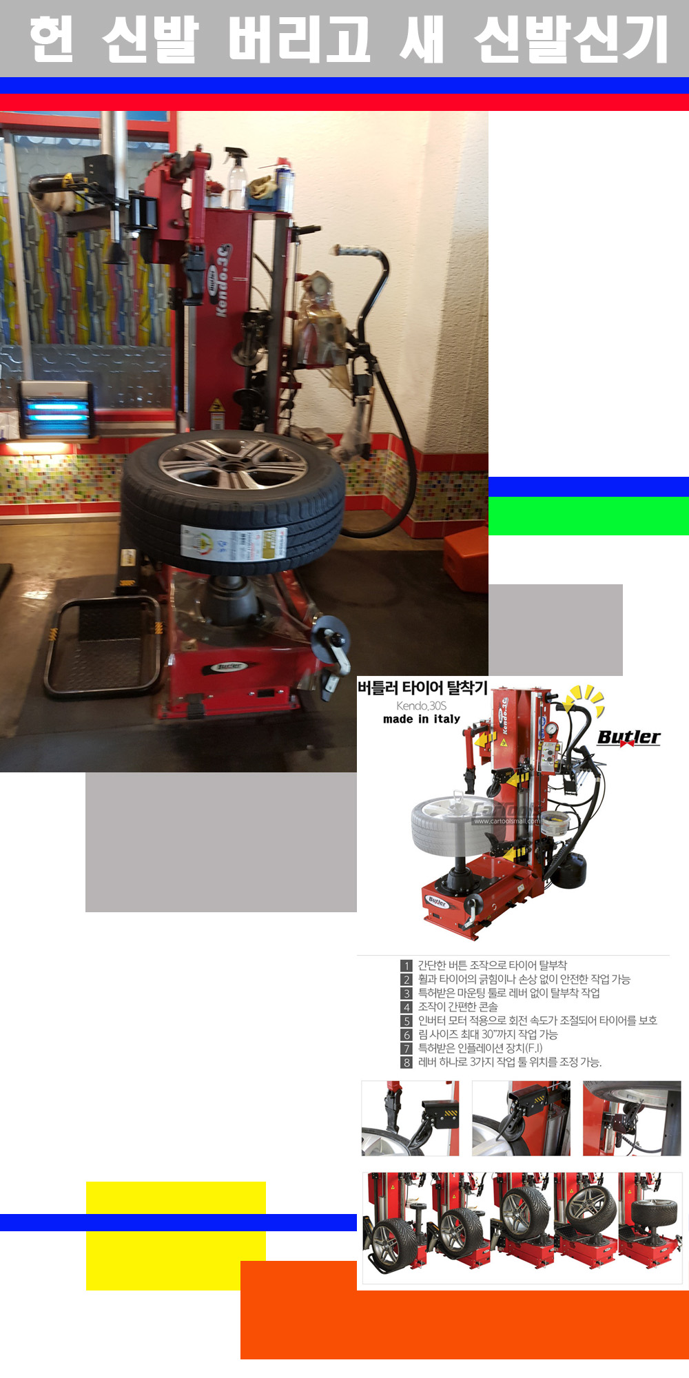 이태리 버틀러사의 켄도3.0S는 휠과 타이어와 조립과 분리시 전혀 제품에 손상을 주지않는 탈착기로 특히 센터락방식(중앙에서 휠를 고정하는 방식)이여서 휠의 중앙부위 잡아서 타이어를 탈부착하고 이후 상하롤러로 타이어를 탈부착합니다 특히 유니포미티작업(휠의 가장가벼운부분과 타이어의 가장 무거운부분을 매칭시키는 작업)시 작업자가 타이어를 정확한 지점에 휠과 매칭시킬수 있는 장점도 있습니다 유니포미티작업 불량시 과도한 진동값으로 핸들링불안 승차감저하 과도한 노면의 충격흡수를 가져와 주행감성을 해치는 첫번째 이유입니다 하지만 이런 작업을 무시하고 그냥 정적인 휠발란스작업만 하는것이 현실입니다 보통 타이어가격만 생각하시고 장착을 하시는데 꼭 이런 부분까지 챙길수 있는 샵을 권장합니다