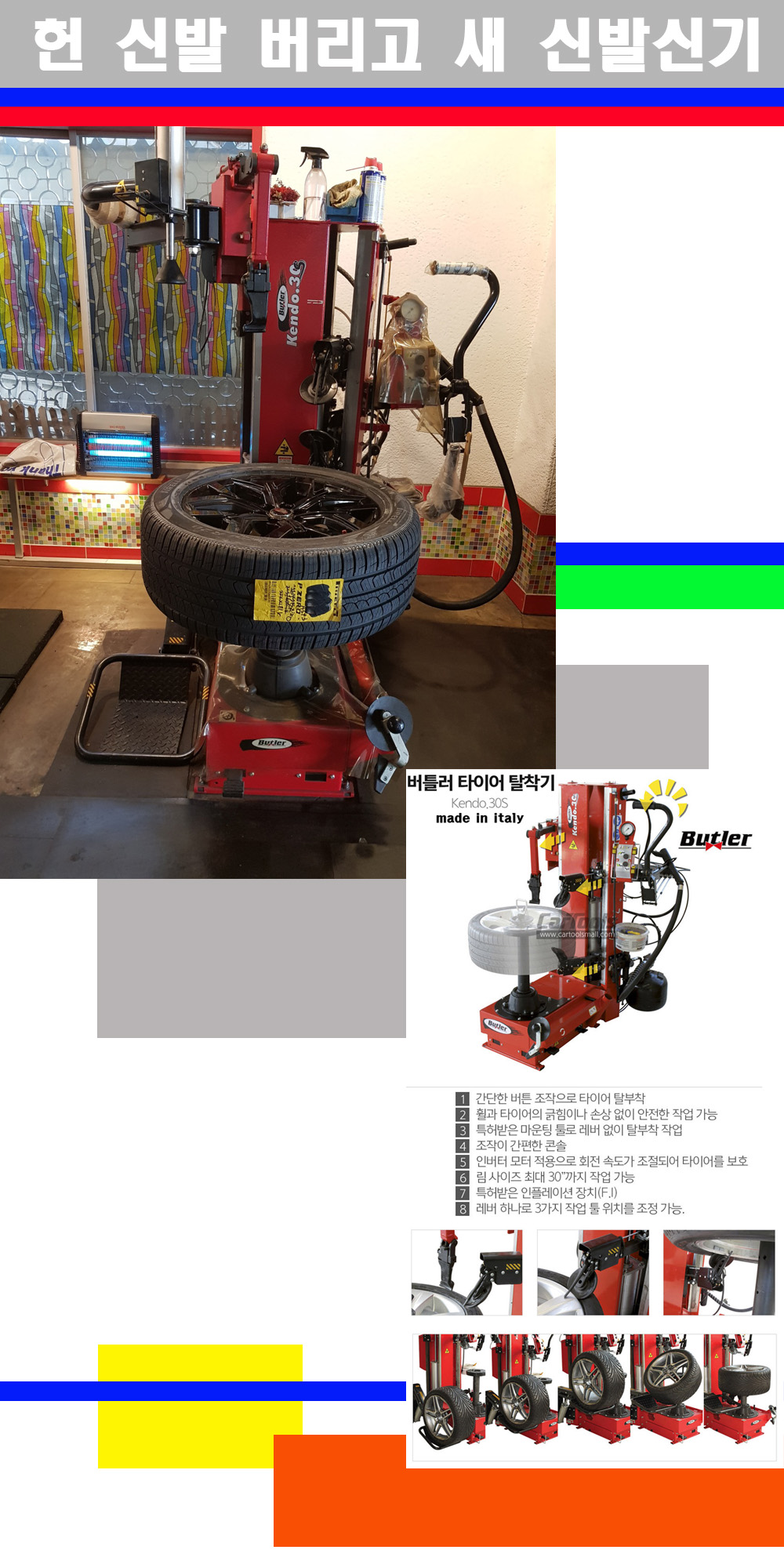 이태리 버틀러사의 켄도3.0S는 휠과 타이어와 조립과 분리시 전혀 제품에 손상을 주지않는 탈착기로 특히 센터락방식(중앙에서 휠를 고정하는 방식)이여서 휠의 중앙부위 잡아서 타이어를 탈부착하고 이후 상하롤러로 타이어를 탈부착합니다 특히 유니포미티작업(휠의 가장가벼운부분과 타이어의 가장 무거운부분을 매칭시키는 작업)시 작업자가 타이어를 정확한 지점에 휠과 매칭시킬수 있는 장점도 있습니다 유니포미티작업 불량시 과도한 진동값으로 핸들링불안 승차감저하 과도한 노면의 충격흡수를 가져와 주행감성을 해치는 첫번째 이유입니다 하지만 이런 작업을 무시하고 그냥 정적인 휠발란스작업만 하는것이 현실입니다 보통 타이어가격만 생각하시고 장착을 하시는데 꼭 이런 부분까지 챙길수 있는 샵을 권장합니다