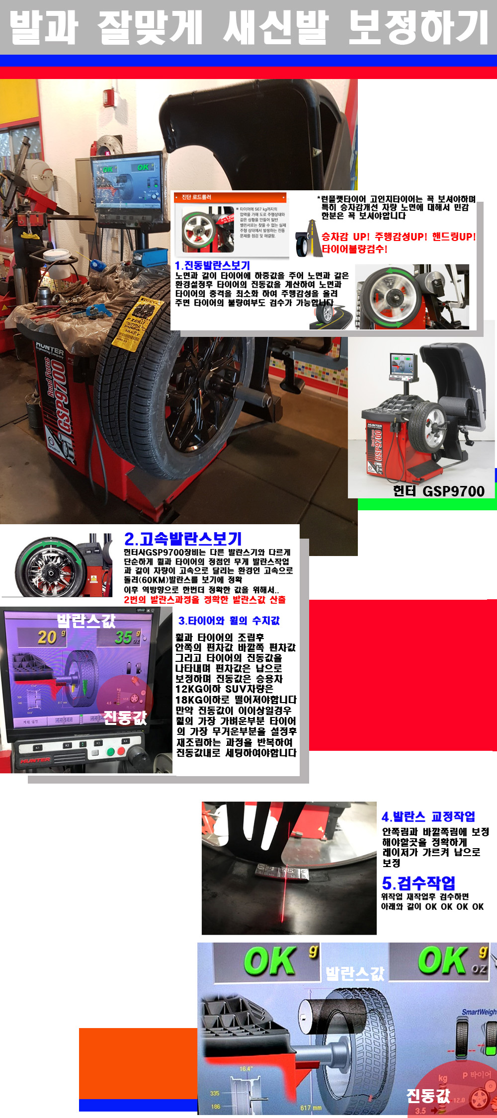 이후 미국 헌터사 GSP9700장비로 고속 및 진동발란스로 더욱더 작업의 정확도와 정밀도를 높였습니다 이장비는 노면에서 올라오는 진동값까지 계산하여 발란스값을 보는 방식으로 진동발란스기는 헌터사GSP9700장비가 유일합니다 이후 역방향으로 60키로의 고속으로 다시 발란스값을 보정하는 방식입니다 그래서 노면에서 올라오는 진동를 잡을수 있으며 특히 타이어의 노면력 측정으로 타이어의 불량여부까지도 검수가 가능한 장비입니다 특히 고속발란스 측정시 타사 발란스기와 틀리게 고속으로 발란스를 보기에 차량이 고속으로 달리는 시뮤레이션 구현이 가능하여 정확한 발란스값을 볼수가 있습니다 그리고 작업자에게는 불필요한 발란스납을 붙이지 않아 미관상으로 좋고 납을 절약하는 고객님에게도윈이고 작업자에게도 윈윈할수 있는 장비입니다 그리고 시중에서 고속진동발란스라고 말하시는 샵들이 많은데 꼭아셔야하는것은 고속발란스는 말그대로 발란스를 볼때 고속으로 돌리기에 60키로 전후 그리고 진동값을 계산하기위해서는 발란스기에 진동롤러가 있어야합니다 그래서 미국헌터사 GSP9700장비가 유일합니다