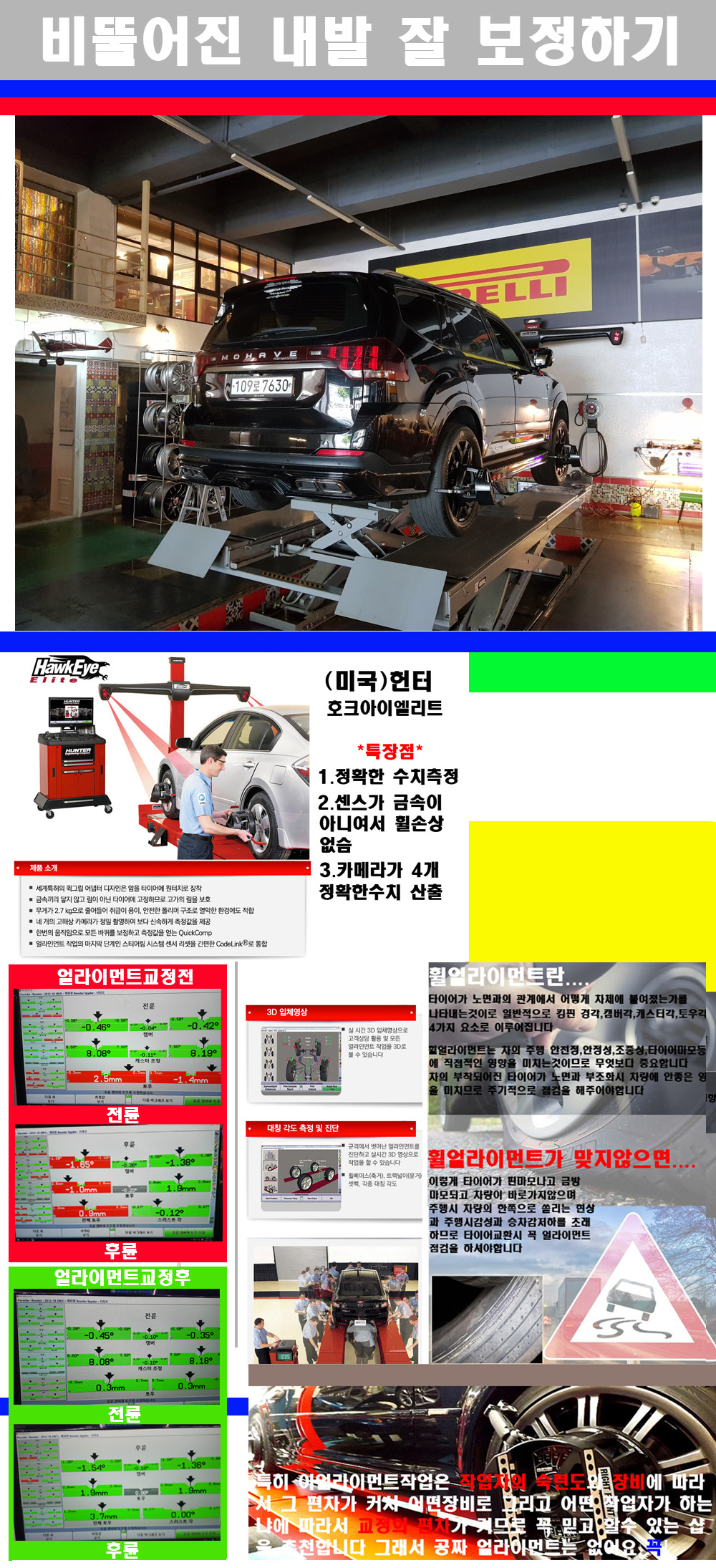 이후 미국 헌터사 호크아이엘리트 장비로 3D얼라이먼트를 진행했습니다 이장비는 현존하는 가장 진화된 얼라이먼트장비입니다 특히 4개의 고성능카메라가 장착되어져 있어 실시간으로 오차가 없는 측정값을 구현하며 바퀴당 각 휠센서 클램프가 프라스틱이며 타이어바닦면을 지지하는 방식이여서 휠의 손상이 없는것이 특징입니다 하지만 장비보다 차량의 얼라이먼트를 볼시 작업자의 정성과 그리고 능력과 숙련도가 관견이기에 꼭 휠얼라이먼트를 장사수단으로 하지않는 샵을 권장합니다 자사는 얼라이먼트정렬시 교정전 교정후를 구분하여 고객님께 직접 이수치값을 확인시켜드리고 작업을 하며 이후 각각의 특성을 가진 타이어들에 대해서 설명 및 관리요령 운전요령 같이 설명해드리고 있습니다 이후 타이어와 휠의 정확한 발란스값과 진동값을 보정후 헌터사 호크아이엘리트 3D얼라이먼트장비로 공장에서 처음 출고될시의 팩토리값으로 교정하였습니다 그리고 타이어질소가스주입기로 3번정도 진공상태로 만든후 질소가스를 주입했습니다 질소가스주입시 가장 관견은 순도이기에 이런 여러번의 진공상태후 주입하고 빼주는 과정를 많이 해주어야합니다 질소가스의 주입시 타이어공기압의 저하가 덜하고 화합물질이 반응을 하지않아 소음전파력과 그리고 타이어안쪽에 수분을 발생하지않으며 타이어안쪽에서의 공기압이 팽창하지않아 타이어에 스트레스를 덜주게 됩니다 하지만 이부분도 공기속에 질소가 80%정도 존재하기에 미미한 차이이지만 질소순도를 높이고 주행시 좋은 점이 확연히 많기에 질소주입을 해드리고 있습니다 특히 고성능타이어나 하중값을 많이 주는 타이어일경우에는 위에서 언급한 부분에서 많이 차이를 보이고 있습니다 이후 타이어왁싱후 출고했습니다+ 감사합니다 |