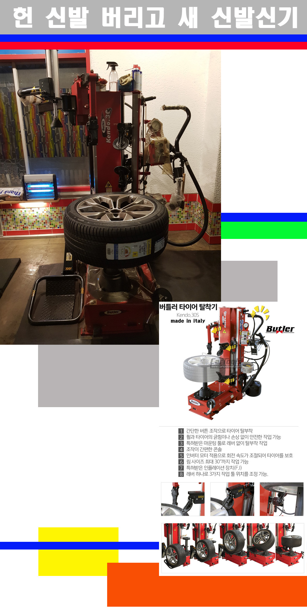 이태리 버틀러사의 켄도3.0S는 휠과 타이어와 조립과 분리시 전혀 제품에 손상을 주지않는 탈착기로 특히 센터락방식(중앙에서 휠를 고정하는 방식)이여서 휠의 중앙부위 잡아서 타이어를 탈부착하고 이후 상하롤러로 타이어를 탈부착합니다 특히 유니포미티작업(휠의 가장가벼운부분과 타이어의 가장 무거운부분을 매칭시키는 작업)시 작업자가 타이어를 정확한 지점에 휠과 매칭시킬수 있는 장점도 있습니다 유니포미티작업 불량시 과도한 진동값으로 핸들링불안 승차감저하 과도한 노면의 충격흡수를 가져와 주행감성을 해치는 첫번째 이유입니다 하지만 이런 작업을 무시하고 그냥 정적인 휠발란스작업만 하는것이 현실입니다 보통 타이어가격만 생각하시고 장착을 하시는데 꼭 이런 부분까지 챙길수 있는 샵을 권장합니다