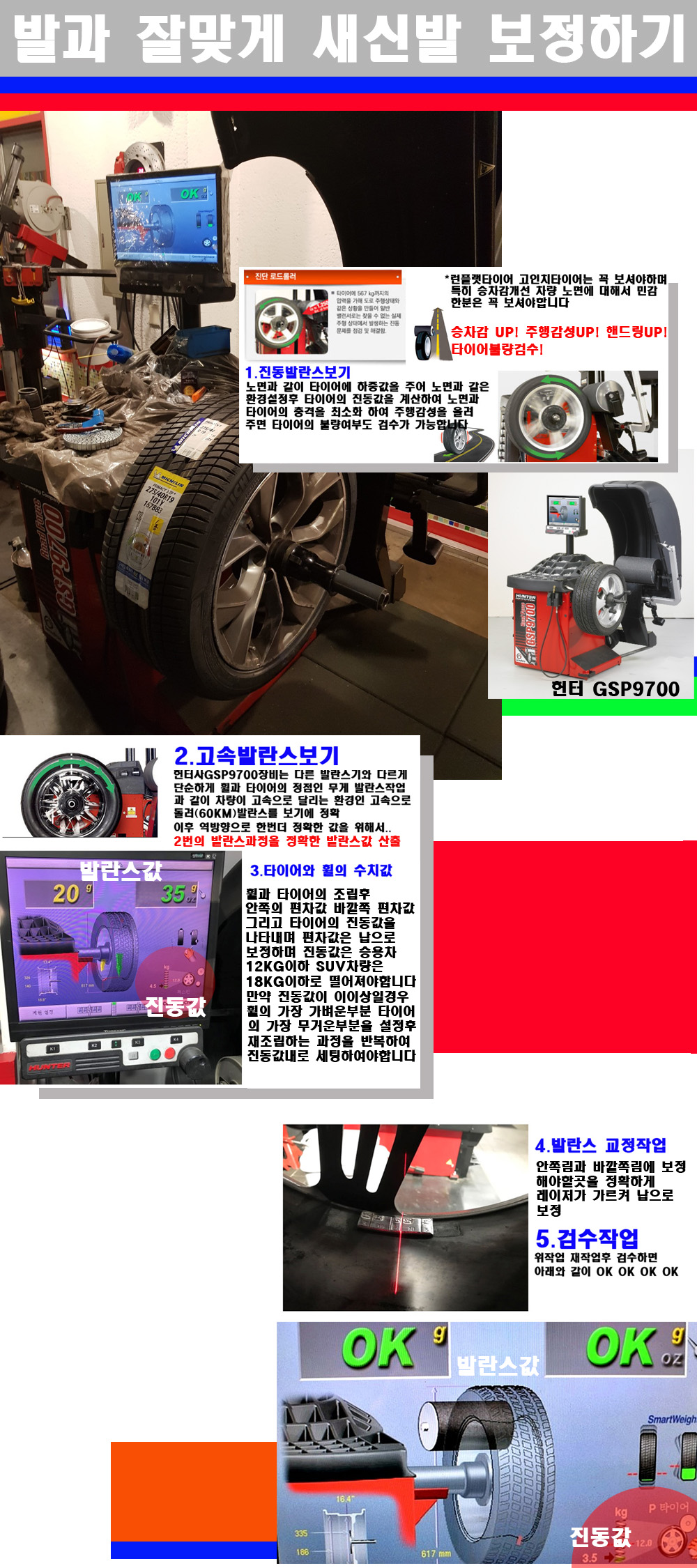이후 미국 헌터사 GSP9700장비로 고속 및 진동발란스로 더욱더 작업의 정확도와 정밀도를 높였습니다 이장비는 노면에서 올라오는 진동값까지 계산하여 발란스값을 보는 방식으로 진동발란스기는 헌터사GSP9700장비가 유일합니다 이후 역방향으로 60키로의 고속으로 다시 발란스값을 보정하는 방식입니다 그래서 노면에서 올라오는 진동를 잡을수 있으며 특히 타이어의 노면력 측정으로 타이어의 불량여부까지도 검수가 가능한 장비입니다 특히 고속발란스 측정시 타사 발란스기와 틀리게 고속으로 발란스를 보기에 차량이 고속으로 달리는 시뮤레이션 구현이 가능하여 정확한 발란스값을 볼수가 있습니다 그리고 작업자에게는 불필요한 발란스납을 붙이지 않아 미관상으로 좋고 납을 절약하는 고객님에게도윈이고 작업자에게도 윈윈할수 있는 장비입니다 그리고 시중에서 고속진동발란스라고 말하시는 샵들이 많은데 꼭아셔야하는것은 고속발란스는 말그대로 발란스를 볼때 고속으로 돌리기에 60키로 전후 그리고 진동값을 계산하기위해서는 발란스기에 진동롤러가 있어야합니다 그래서 미국헌터사 GSP9700장비가 유일합니다
