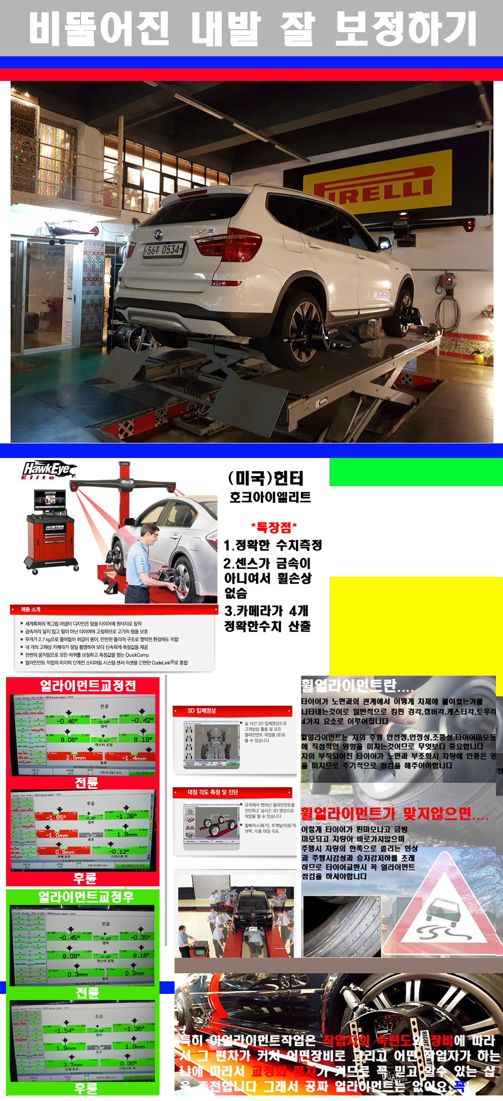 이후 미국 헌터사 호크아이엘리트 장비로 3D얼라이먼트를 진행했습니다 이장비는 현존하는 가장 진화된 얼라이먼트장비입니다 특히 4개의 고성능카메라가 장착되어져 있어 실시간으로 오차가 없는 측정값을 구현하며 바퀴당 각 휠센서 클램프가 프라스틱이며 타이어바닦면을 지지하는 방식이여서 휠의 손상이 없는것이 특징입니다 하지만 장비보다 차량의 얼라이먼트를 볼시 작업자의 정성과 그리고 능력과 숙련도가 관견이기에 꼭 휠얼라이먼트를 장사수단으로 하지않는 샵을 권장합니다 자사는 얼라이먼트정렬시 교정전 교정후를 구분하여 고객님께 직접 이수치값을 확인시켜드리고 작업을 하며 이후 각각의 특성을 가진 타이어들에 대해서 설명 및 관리요령 운전요령 같이 설명해드리고 있습니다 이후 타이어와 휠의 정확한 발란스값과 진동값을 보정후 헌터사 호크아이엘리트 3D얼라이먼트장비로 공장에서 처음 출고될시의 팩토리값으로 교정하였습니다 그리고 타이어질소가스주입기로 3번정도 진공상태로 만든후 질소가스를 주입했습니다 질소가스주입시 가장 관견은 순도이기에 이런 여러번의 진공상태후 주입하고 빼주는 과정를 많이 해주어야합니다 질소가스의 주입시 타이어공기압의 저하가 덜하고 화합물질이 반응을 하지않아 소음전파력과 그리고 타이어안쪽에 수분을 발생하지않으며 타이어안쪽에서의 공기압이 팽창하지않아 타이어에 스트레스를 덜주게 됩니다 하지만 이부분도 공기속에 질소가 80%정도 존재하기에 미미한 차이이지만 질소순도를 높이고 주행시 좋은 점이 확연히 많기에 질소주입을 해드리고 있습니다 특히 고성능타이어나 하중값을 많이 주는 타이어일경우에는 위에서 언급한 부분에서 많이 차이를 보이고 있습니다 이후 타이어왁싱후 출고했습니다+ 감사합니다 |