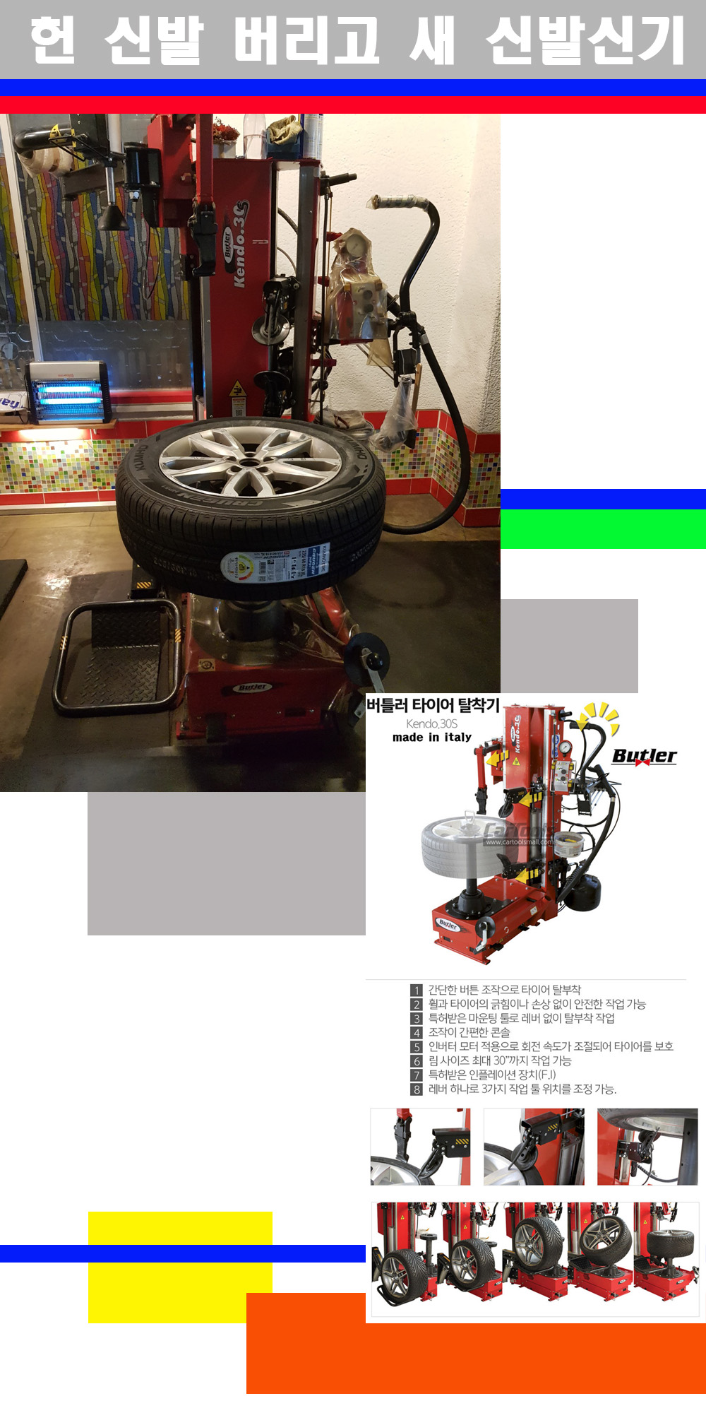이태리 버틀러사의 켄도3.0S는 휠과 타이어와 조립과 분리시 전혀 제품에 손상을 주지않는 탈착기로 특히 센터락방식(중앙에서 휠를 고정하는 방식)이여서 휠의 중앙부위 잡아서 타이어를 탈부착하고 이후 상하롤러로 타이어를 탈부착합니다 특히 유니포미티작업(휠의 가장가벼운부분과 타이어의 가장 무거운부분을 매칭시키는 작업)시 작업자가 타이어를 정확한 지점에 휠과 매칭시킬수 있는 장점도 있습니다 유니포미티작업 불량시 과도한 진동값으로 핸들링불안 승차감저하 과도한 노면의 충격흡수를 가져와 주행감성을 해치는 첫번째 이유입니다 하지만 이런 작업을 무시하고 그냥 정적인 휠발란스작업만 하는것이 현실입니다 보통 타이어가격만 생각하시고 장착을 하시는데 꼭 이런 부분까지 챙길수 있는 샵을 권장합니다