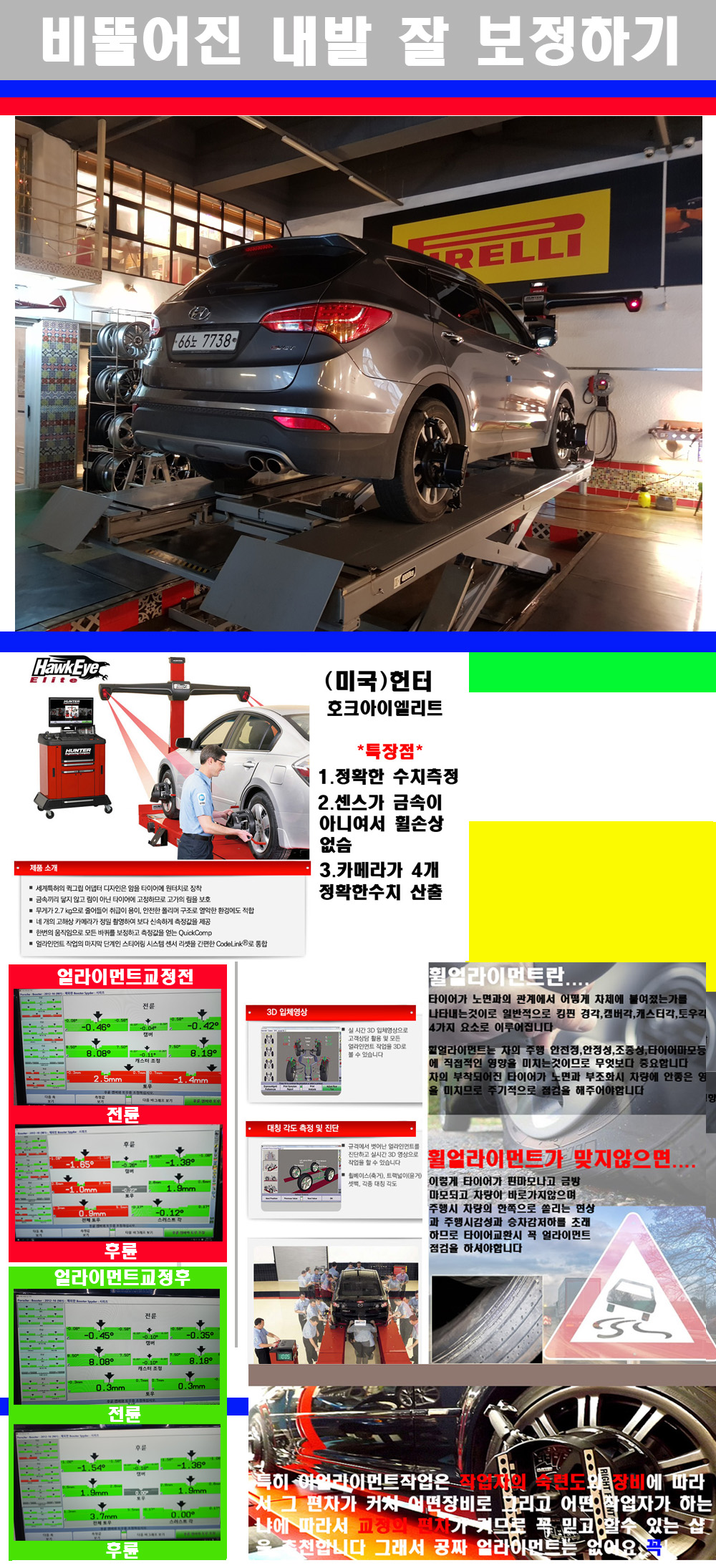 이후 미국 헌터사 호크아이엘리트 장비로 3D얼라이먼트를 진행했습니다 이장비는 현존하는 가장 진화된 얼라이먼트장비입니다 특히 4개의 고성능카메라가 장착되어져 있어 실시간으로 오차가 없는 측정값을 구현하며 바퀴당 각 휠센서 클램프가 프라스틱이며 타이어바닦면을 지지하는 방식이여서 휠의 손상이 없는것이 특징입니다 하지만 장비보다 차량의 얼라이먼트를 볼시 작업자의 정성과 그리고 능력과 숙련도가 관견이기에 꼭 휠얼라이먼트를 장사수단으로 하지않는 샵을 권장합니다 자사는 얼라이먼트정렬시 교정전 교정후를 구분하여 고객님께 직접 이수치값을 확인시켜드리고 작업을 하며 이후 각각의 특성을 가진 타이어들에 대해서 설명 및 관리요령 운전요령 같이 설명해드리고 있습니다 이후 타이어와 휠의 정확한 발란스값과 진동값을 보정후 헌터사 호크아이엘리트 3D얼라이먼트장비로 공장에서 처음 출고될시의 팩토리값으로 교정하였습니다 그리고 타이어질소가스주입기로 3번정도 진공상태로 만든후 질소가스를 주입했습니다 질소가스주입시 가장 관견은 순도이기에 이런 여러번의 진공상태후 주입하고 빼주는 과정를 많이 해주어야합니다 질소가스의 주입시 타이어공기압의 저하가 덜하고 화합물질이 반응을 하지않아 소음전파력과 그리고 타이어안쪽에 수분을 발생하지않으며 타이어안쪽에서의 공기압이 팽창하지않아 타이어에 스트레스를 덜주게 됩니다 하지만 이부분도 공기속에 질소가 80%정도 존재하기에 미미한 차이이지만 질소순도를 높이고 주행시 좋은 점이 확연히 많기에 질소주입을 해드리고 있습니다 특히 고성능타이어나 하중값을 많이 주는 타이어일경우에는 위에서 언급한 부분에서 많이 차이를 보이고 있습니다 이후 타이어왁싱후 출고했습니다+ 감사합니다 |