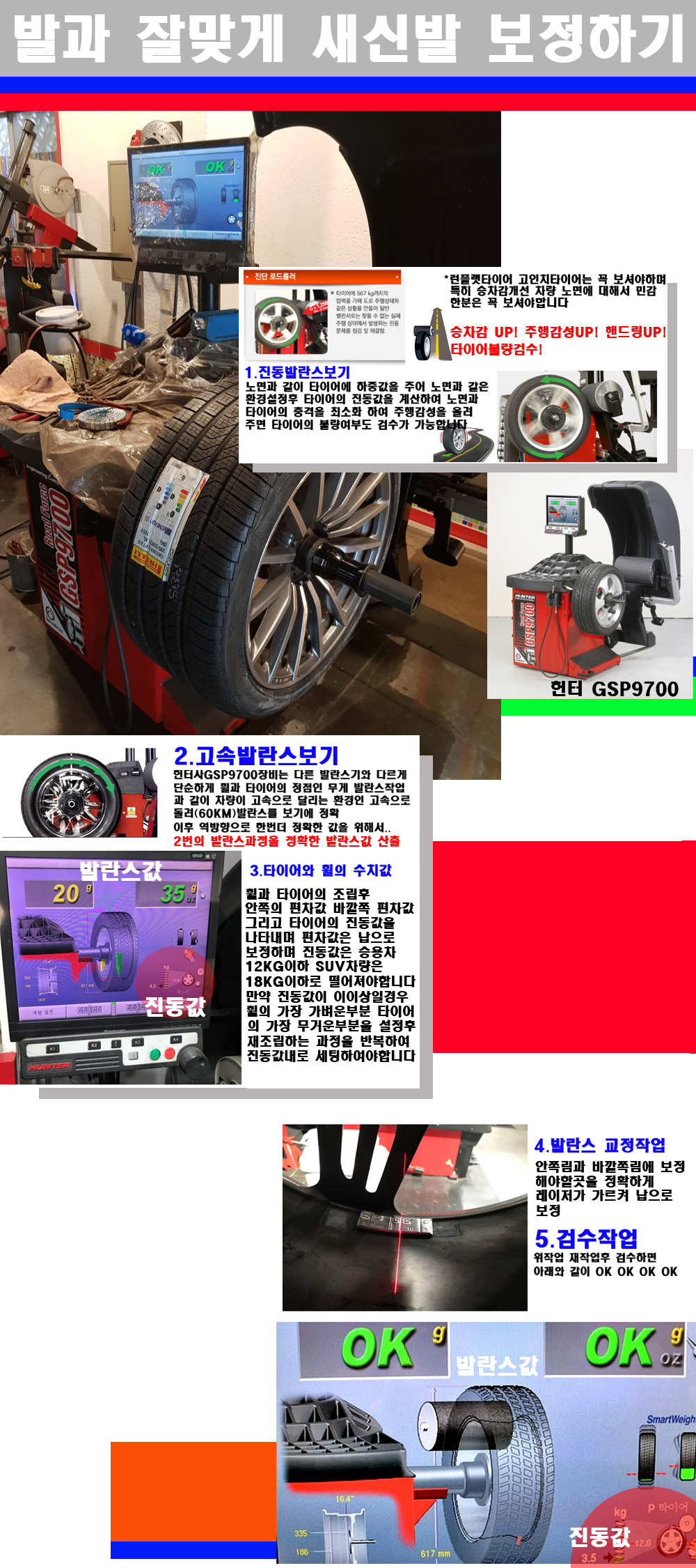 이후 미국 헌터사 GSP9700장비로 고속 및 진동발란스로 더욱더 작업의 정확도와 정밀도를 높였습니다 이장비는 노면에서 올라오는 진동값까지 계산하여 발란스값을 보는 방식으로 진동발란스기는 헌터사GSP9700장비가 유일합니다 이후 역방향으로 60키로의 고속으로 다시 발란스값을 보정하는 방식입니다 그래서 노면에서 올라오는 진동를 잡을수 있으며 특히 타이어의 노면력 측정으로 타이어의 불량여부까지도 검수가 가능한 장비입니다 특히 고속발란스 측정시 타사 발란스기와 틀리게 고속으로 발란스를 보기에 차량이 고속으로 달리는 시뮤레이션 구현이 가능하여 정확한 발란스값을 볼수가 있습니다 그리고 작업자에게는 불필요한 발란스납을 붙이지 않아 미관상으로 좋고 납을 절약하는 고객님에게도윈이고 작업자에게도 윈윈할수 있는 장비입니다 그리고 시중에서 고속진동발란스라고 말하시는 샵들이 많은데 꼭아셔야하는것은 고속발란스는 말그대로 발란스를 볼때 고속으로 돌리기에 60키로 전후 그리고 진동값을 계산하기위해서는 발란스기에 진동롤러가 있어야합니다 그래서 미국헌터사 GSP9700장비가 유일합니다