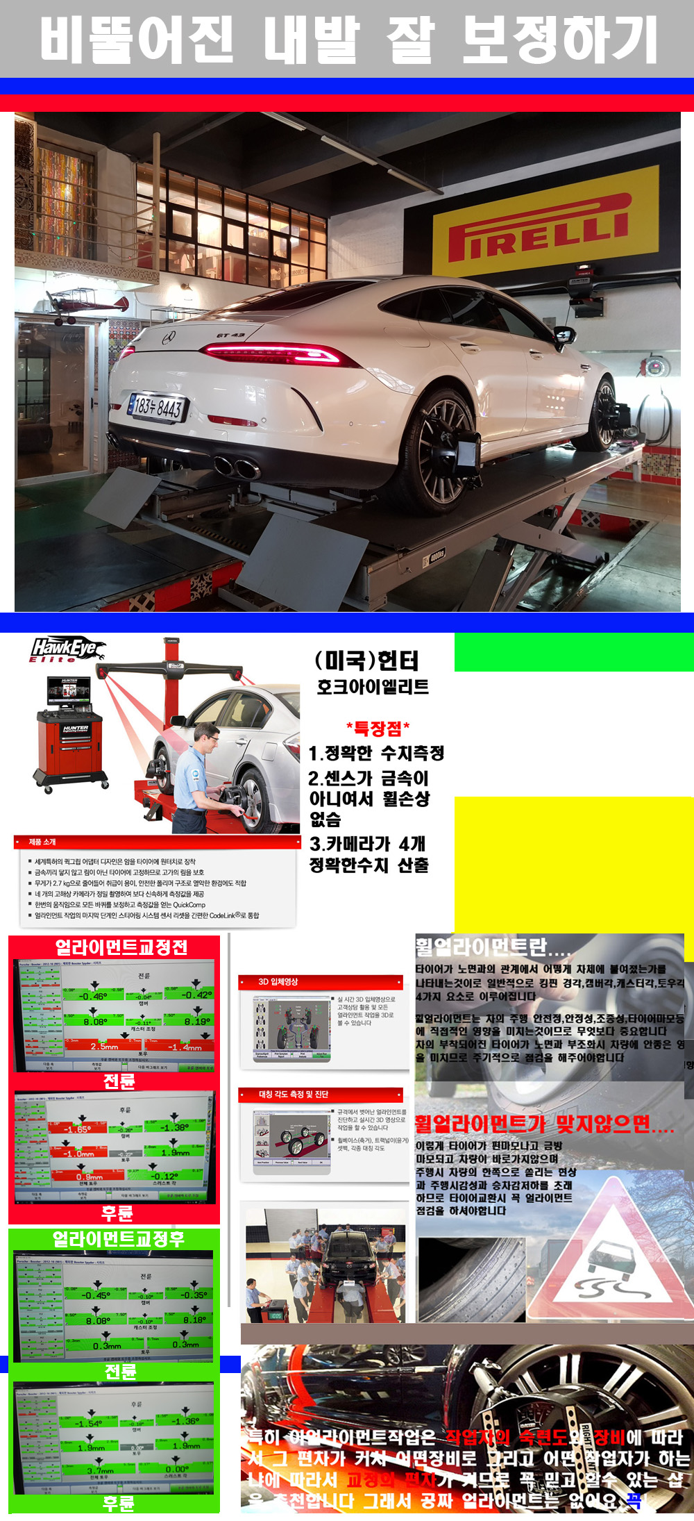 이후 미국 헌터사 호크아이엘리트 장비로 3D얼라이먼트를 진행했습니다 이장비는 현존하는 가장 진화된 얼라이먼트장비입니다 특히 4개의 고성능카메라가 장착되어져 있어 실시간으로 오차가 없는 측정값을 구현하며 바퀴당 각 휠센서 클램프가 프라스틱이며 타이어바닦면을 지지하는 방식이여서 휠의 손상이 없는것이 특징입니다 하지만 장비보다 차량의 얼라이먼트를 볼시 작업자의 정성과 그리고 능력과 숙련도가 관견이기에 꼭 휠얼라이먼트를 장사수단으로 하지않는 샵을 권장합니다 자사는 얼라이먼트정렬시 교정전 교정후를 구분하여 고객님께 직접 이수치값을 확인시켜드리고 작업을 하며 이후 각각의 특성을 가진 타이어들에 대해서 설명 및 관리요령 운전요령 같이 설명해드리고 있습니다 이후 타이어와 휠의 정확한 발란스값과 진동값을 보정후 헌터사 호크아이엘리트 3D얼라이먼트장비로 공장에서 처음 출고될시의 팩토리값으로 교정하였습니다 그리고 타이어질소가스주입기로 3번정도 진공상태로 만든후 질소가스를 주입했습니다 질소가스주입시 가장 관견은 순도이기에 이런 여러번의 진공상태후 주입하고 빼주는 과정를 많이 해주어야합니다 질소가스의 주입시 타이어공기압의 저하가 덜하고 화합물질이 반응을 하지않아 소음전파력과 그리고 타이어안쪽에 수분을 발생하지않으며 타이어안쪽에서의 공기압이 팽창하지않아 타이어에 스트레스를 덜주게 됩니다 하지만 이부분도 공기속에 질소가 80%정도 존재하기에 미미한 차이이지만 질소순도를 높이고 주행시 좋은 점이 확연히 많기에 질소주입을 해드리고 있습니다 특히 고성능타이어나 하중값을 많이 주는 타이어일경우에는 위에서 언급한 부분에서 많이 차이를 보이고 있습니다 이후 타이어왁싱후 출고했습니다+ 감사합니다 |