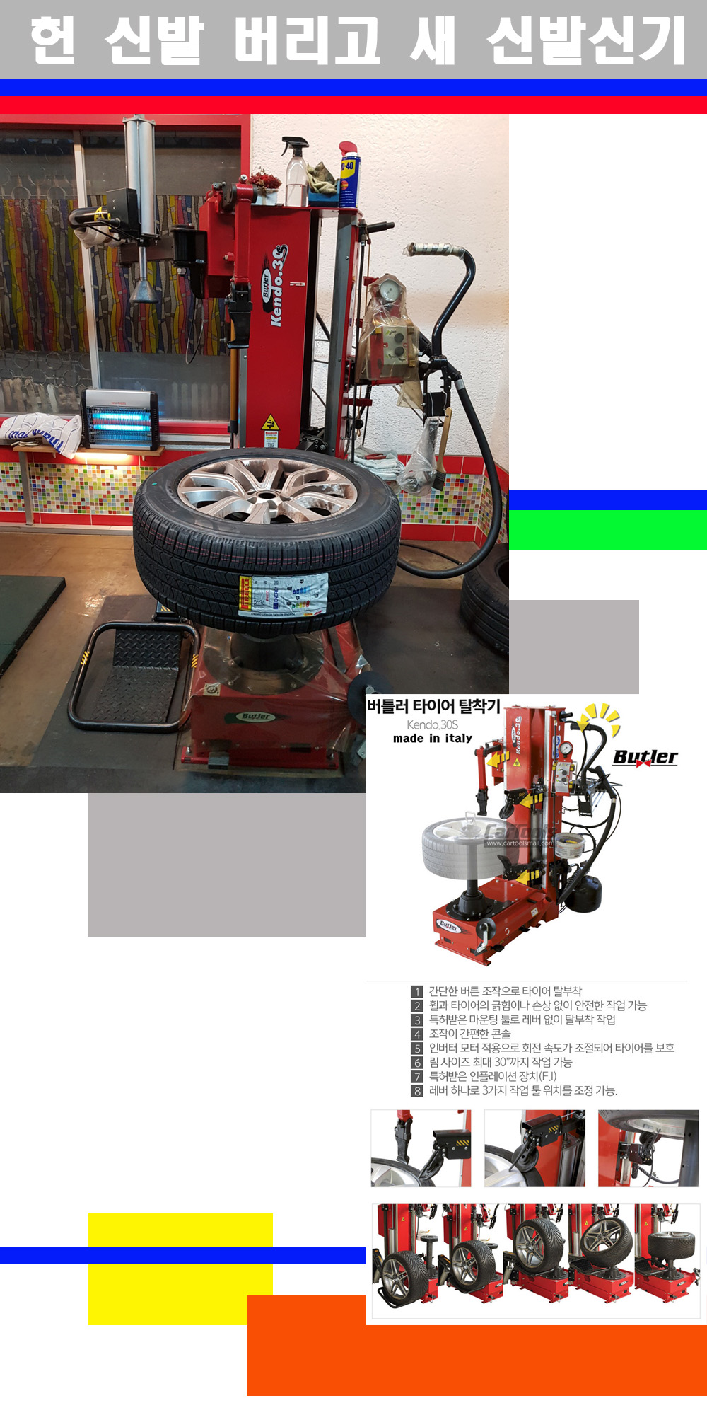이태리 버틀러사의 켄도3.0S는 휠과 타이어와 조립과 분리시 전혀 제품에 손상을 주지않는 탈착기로 특히 센터락방식(중앙에서 휠를 고정하는 방식)이여서 휠의 중앙부위 잡아서 타이어를 탈부착하고 이후 상하롤러로 타이어를 탈부착합니다 특히 유니포미티작업(휠의 가장가벼운부분과 타이어의 가장 무거운부분을 매칭시키는 작업)시 작업자가 타이어를 정확한 지점에 휠과 매칭시킬수 있는 장점도 있습니다 유니포미티작업 불량시 과도한 진동값으로 핸들링불안 승차감저하 과도한 노면의 충격흡수를 가져와 주행감성을 해치는 첫번째 이유입니다 하지만 이런 작업을 무시하고 그냥 정적인 휠발란스작업만 하는것이 현실입니다 보통 타이어가격만 생각하시고 장착을 하시는데 꼭 이런 부분까지 챙길수 있는 샵을 권장합니다