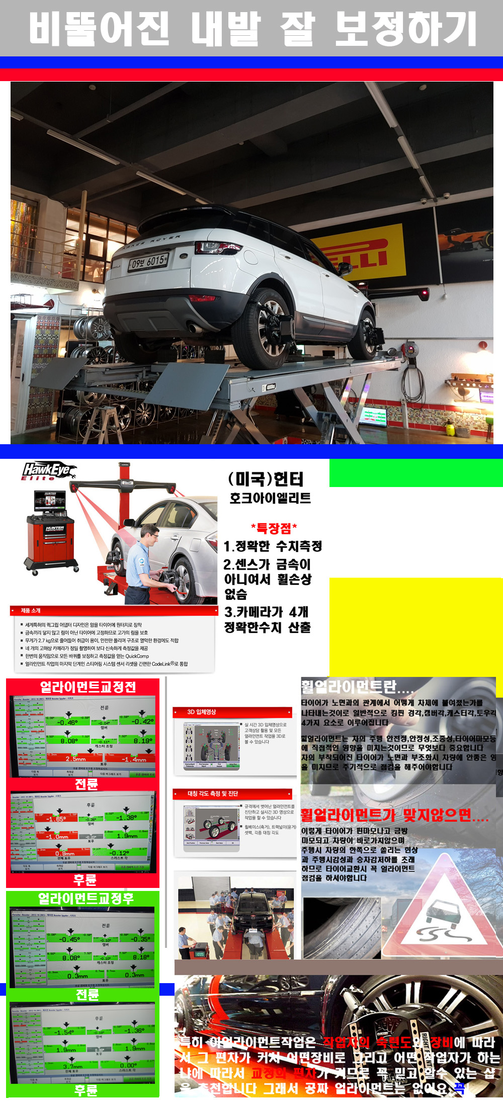 이후 미국 헌터사 호크아이엘리트 장비로 3D얼라이먼트를 진행했습니다 이장비는 현존하는 가장 진화된 얼라이먼트장비입니다 특히 4개의 고성능카메라가 장착되어져 있어 실시간으로 오차가 없는 측정값을 구현하며 바퀴당 각 휠센서 클램프가 프라스틱이며 타이어바닦면을 지지하는 방식이여서 휠의 손상이 없는것이 특징입니다 하지만 장비보다 차량의 얼라이먼트를 볼시 작업자의 정성과 그리고 능력과 숙련도가 관견이기에 꼭 휠얼라이먼트를 장사수단으로 하지않는 샵을 권장합니다 자사는 얼라이먼트정렬시 교정전 교정후를 구분하여 고객님께 직접 이수치값을 확인시켜드리고 작업을 하며 이후 각각의 특성을 가진 타이어들에 대해서 설명 및 관리요령 운전요령 같이 설명해드리고 있습니다 이후 타이어와 휠의 정확한 발란스값과 진동값을 보정후 헌터사 호크아이엘리트 3D얼라이먼트장비로 공장에서 처음 출고될시의 팩토리값으로 교정하였습니다 그리고 타이어질소가스주입기로 3번정도 진공상태로 만든후 질소가스를 주입했습니다 질소가스주입시 가장 관견은 순도이기에 이런 여러번의 진공상태후 주입하고 빼주는 과정를 많이 해주어야합니다 질소가스의 주입시 타이어공기압의 저하가 덜하고 화합물질이 반응을 하지않아 소음전파력과 그리고 타이어안쪽에 수분을 발생하지않으며 타이어안쪽에서의 공기압이 팽창하지않아 타이어에 스트레스를 덜주게 됩니다 하지만 이부분도 공기속에 질소가 80%정도 존재하기에 미미한 차이이지만 질소순도를 높이고 주행시 좋은 점이 확연히 많기에 질소주입을 해드리고 있습니다 특히 고성능타이어나 하중값을 많이 주는 타이어일경우에는 위에서 언급한 부분에서 많이 차이를 보이고 있습니다 이후 타이어왁싱후 출고했습니다+ 감사합니다 |